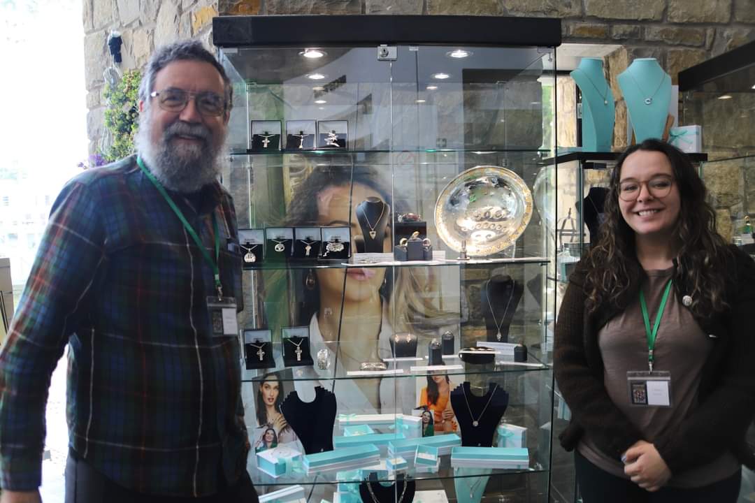 In early June, Sydney was given the opportunity to display the jewelry made for her thesis in Downpatrick, Northern Ireland, amongst some of the most preeminent artists in this specialized field. In a serendipitous twist of fate,the Second International Day of Celtic Art Conference was held June 8th through the 10th, 2023 at the Saint Patrick's Center in Downpatrick, providing the perfect opportunity for the best and brightest in Celtic Art to view, critique, and praise her work. She received rave reviews from the artists in attendance, who were from Scotland, Ireland, the Isle of Man, and the United States. One of the most preeminent of these artists, Aidan Breen, who is a master goldsmith/silversmith that excels in chasing and repousse, was able to observe and critique Sydney's work. His encouragement and feedback was a highlight of the trip for both Sydney and her mentor, Stephen Walker, who is a long-time friend and colleague of Breen's.