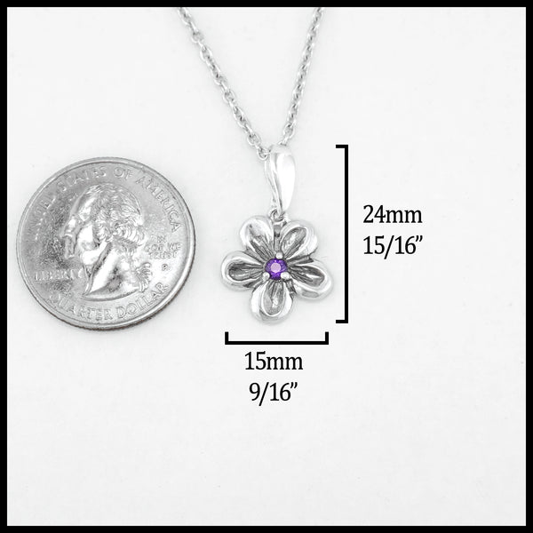This pendant features a sterling silver pansy flower set with a amethyst at its center....