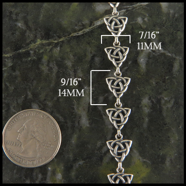 The Celtic Open Trinity Knot bracelet has 11 or 12 links, and is available in Sterling Silver as well as 14K Yellow, Rose, and White gold.