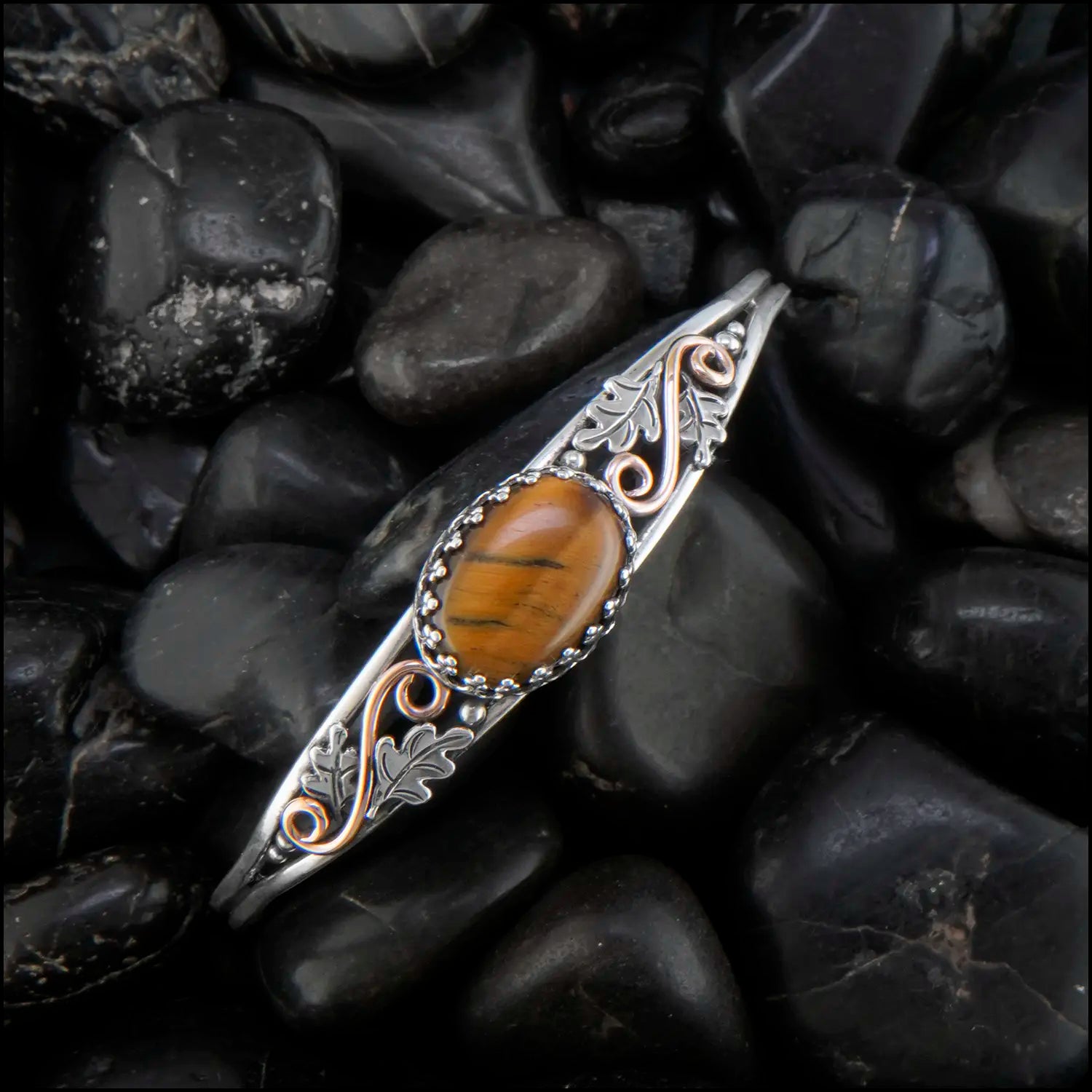 This cuff bracelet is set in a Sterling Silver frame with Oak Leaf and Beading details. Highlighting the Tiger's Eye are 14K rose gold filled spiral accents. This bracelet fits a 7 inch wrist.