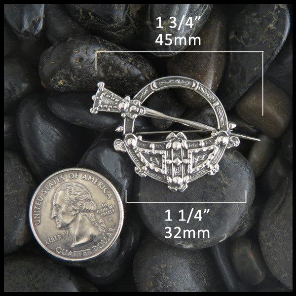 The Tara Brooch in Sterling Silver is a miniaturized replica of the original style historic brooch discovered in Ireland, so named for Tara Hill. The hinged pin back makes this brooch appropriate for a lapel or scarf.