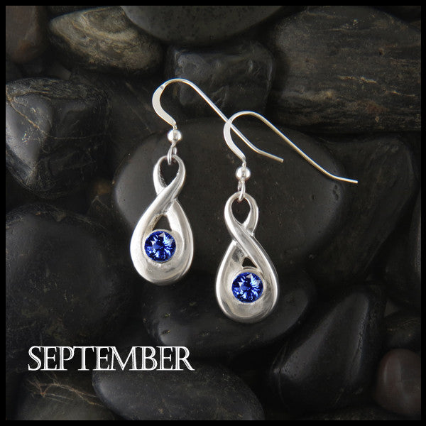 The Sterling Silver Birthstone Drop earrings are an original design by Walker Metalsmiths featuring an elegant eternity knot and a bezel set simulated birthstone of your choice.