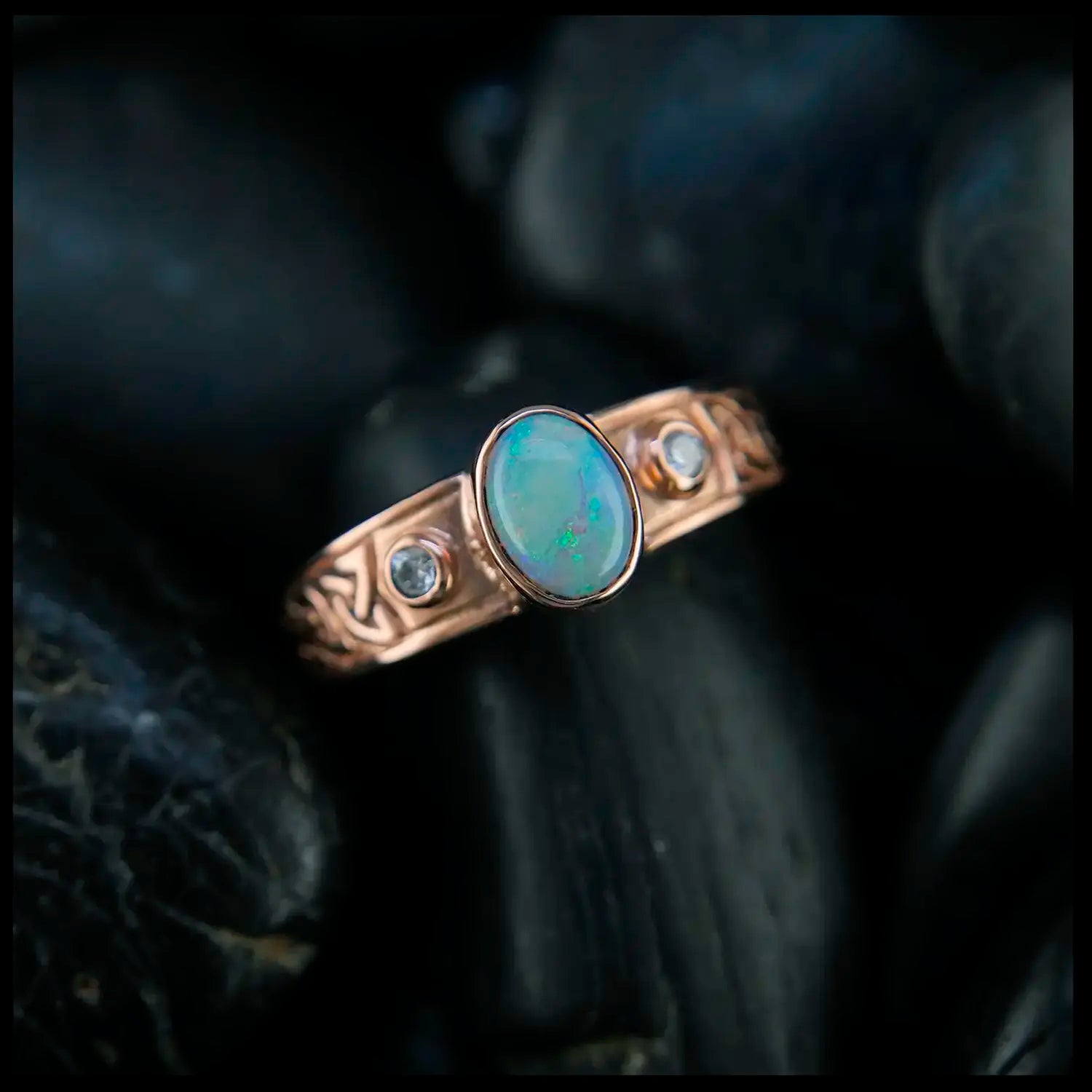 This three stone Celtic knot ring is set with an oval center 7x5mm Opal, with 2mm accent