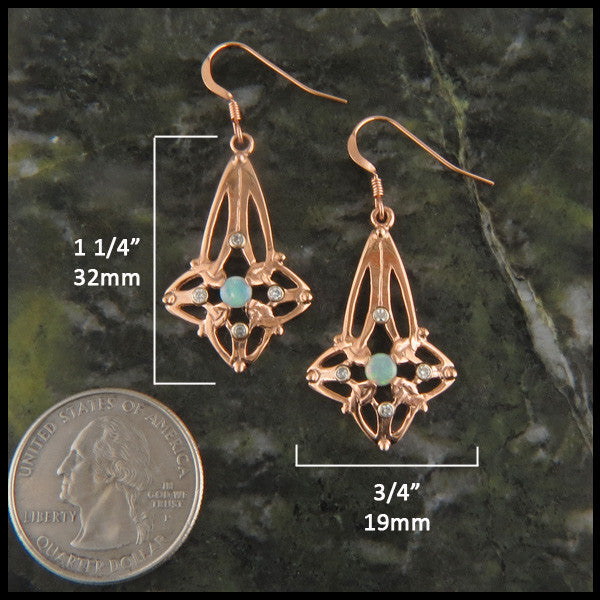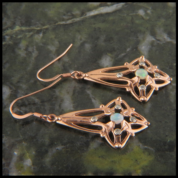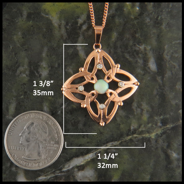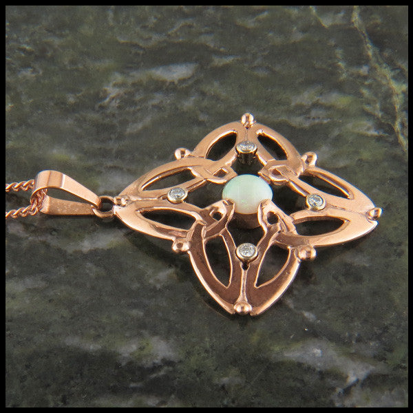 Trinity Knot Pendant and Earring Set in 14K Rose Gold. Pendant is set with a 6mm White Opal in the center accented with 4 - 2mm diamonds. The earrings are each set with a 4mm White Opal, and each contain 4 - 1.5mm diamonds.