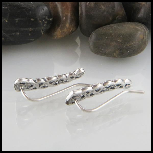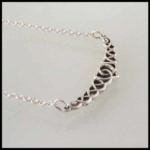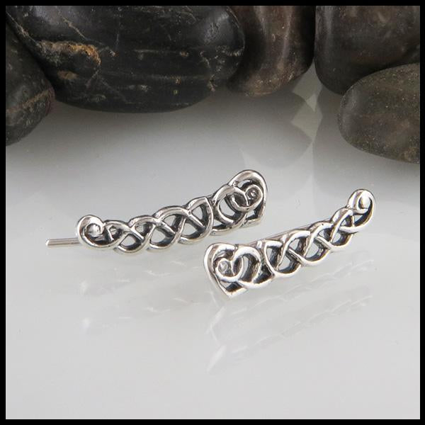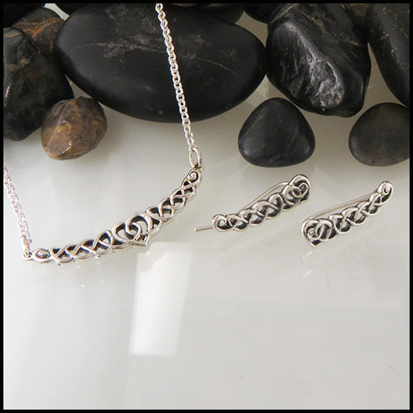The Heart Knot Bar Necklace and Ear Climber set is Sterling Silver. The Heart Knot Necklace is a total of 18" Long including the heart knot and 16" of Sterling Silver cable chain. The Heart Knot ear climbers have sterling silver ear wire.