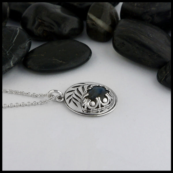 Sterling Silver circular pendant with leaf detail surrounding the teardrop shaped Labradorite stone. The stone...