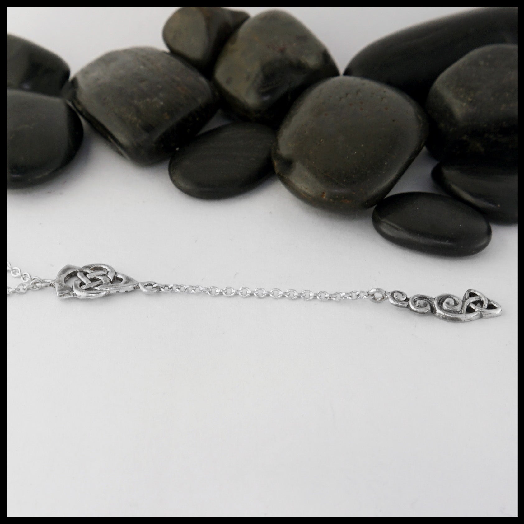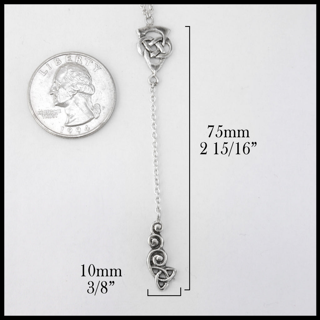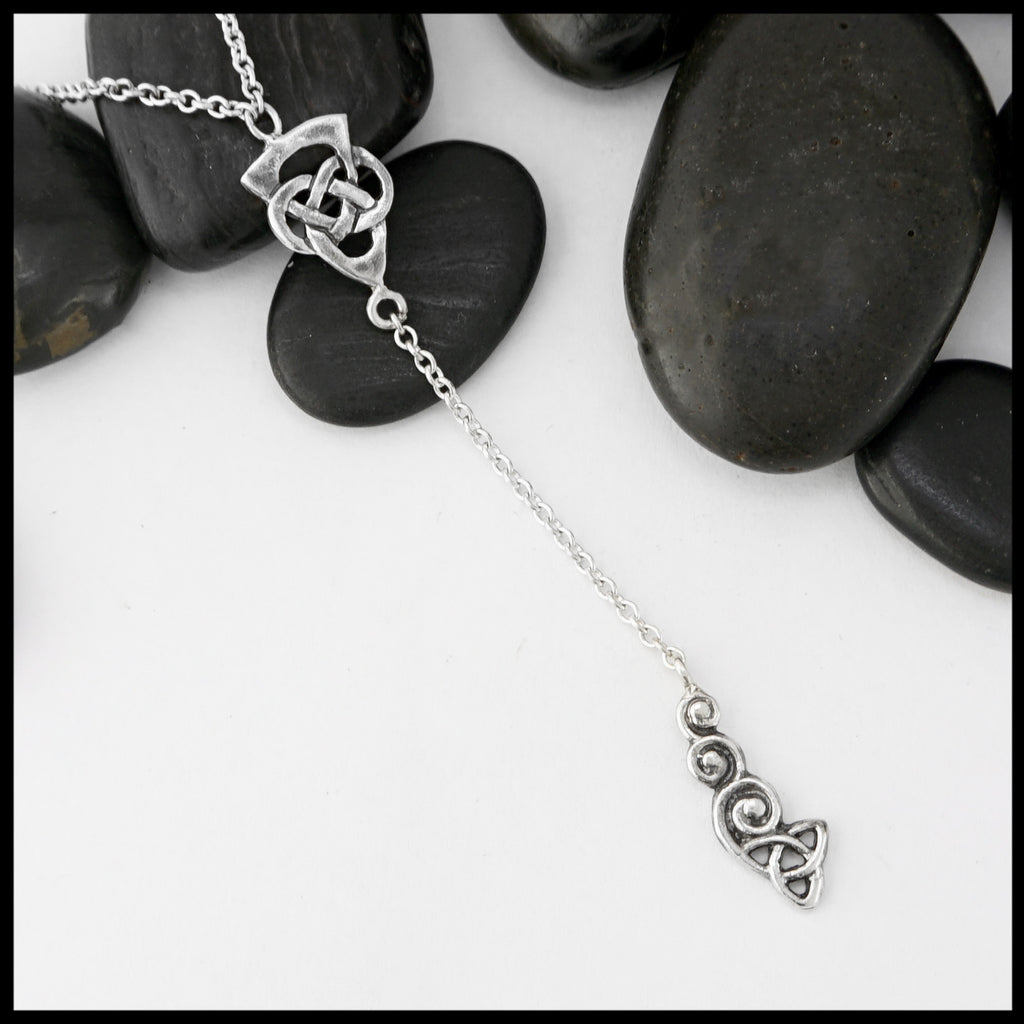 Custom made Sterling Silver Triskele Lariat necklace, featuring Celtic Knot Charms on a 17" cable chain.