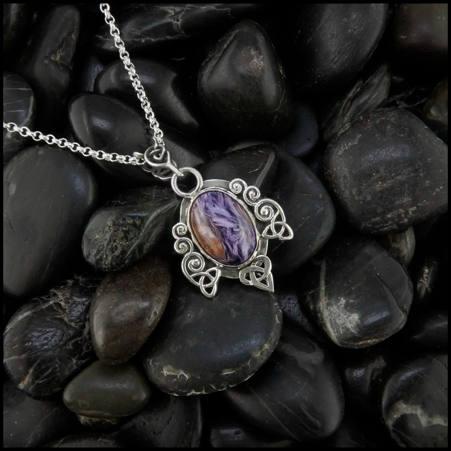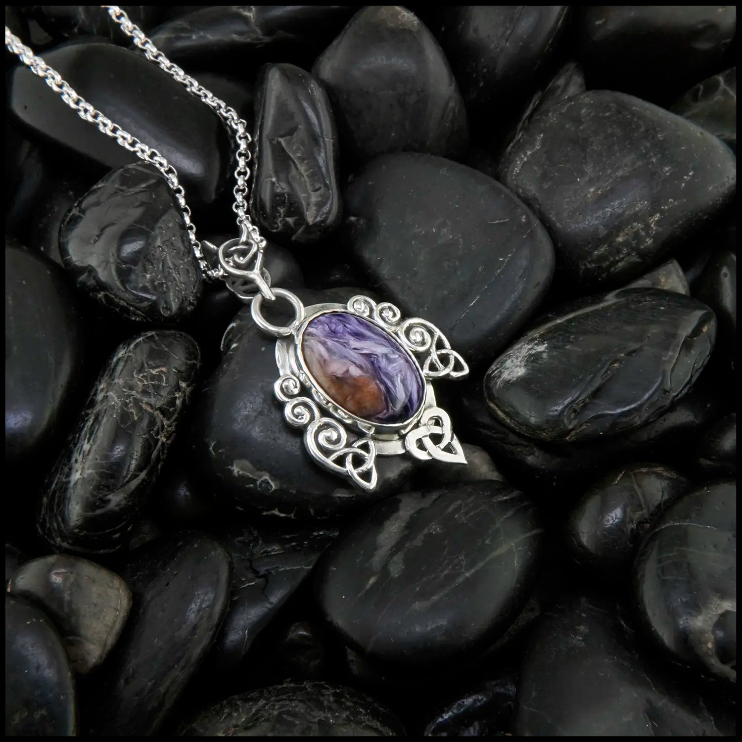 Set in a custom Sterling Silver bezel, and framed by our classic Trinity Knot designs- this Charoite pendant is simply stunning. Featuring a custom bale, this pendant comes on an 18" Rolo chain, and was created by our craftsman's apprentice Dominic!
