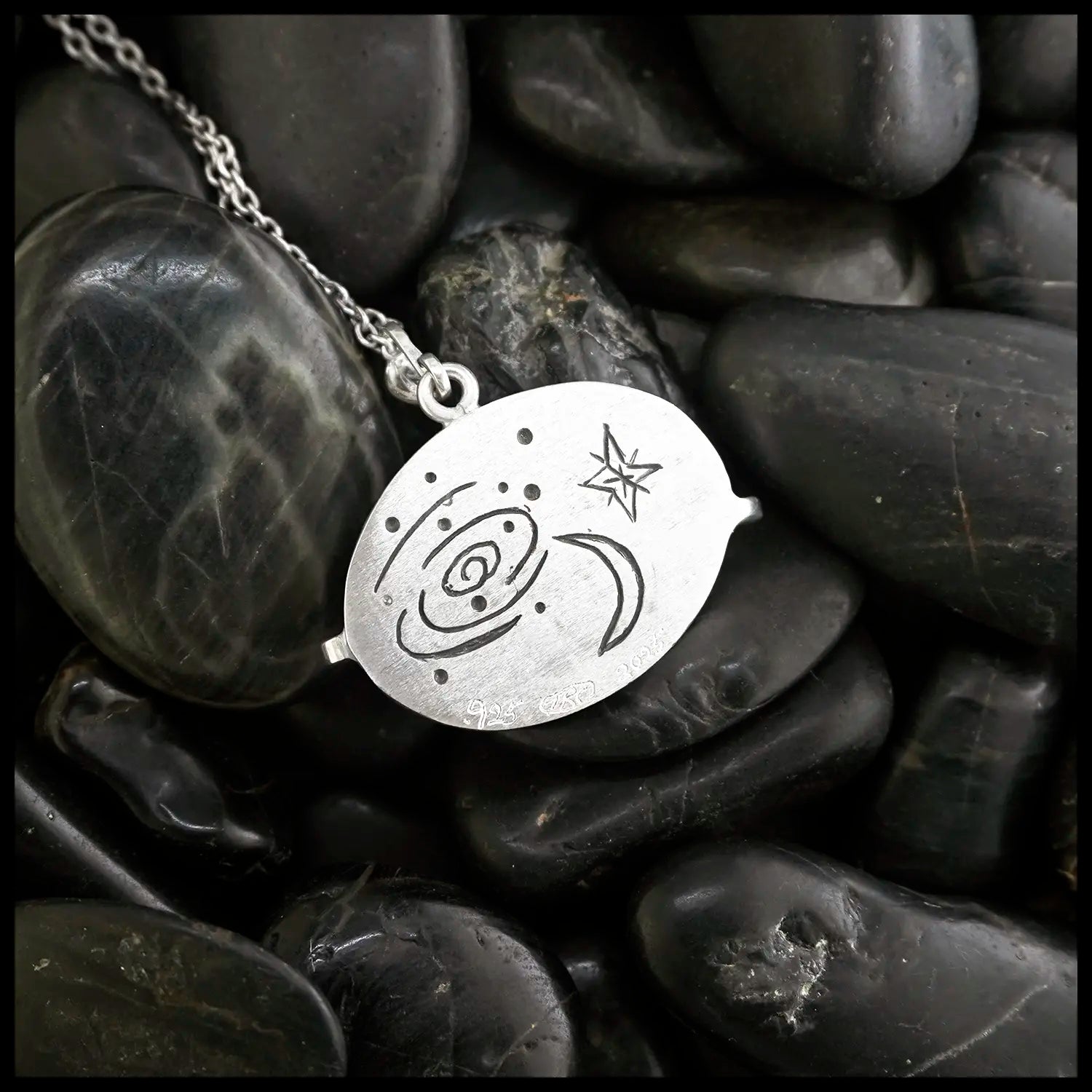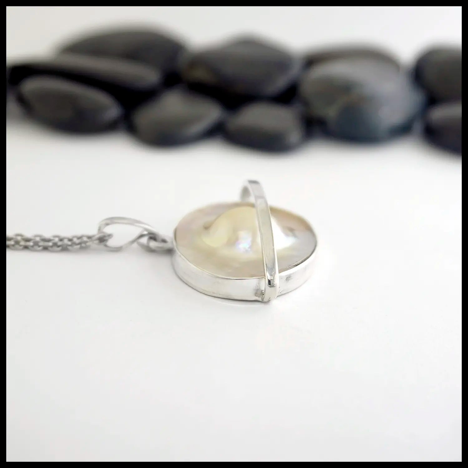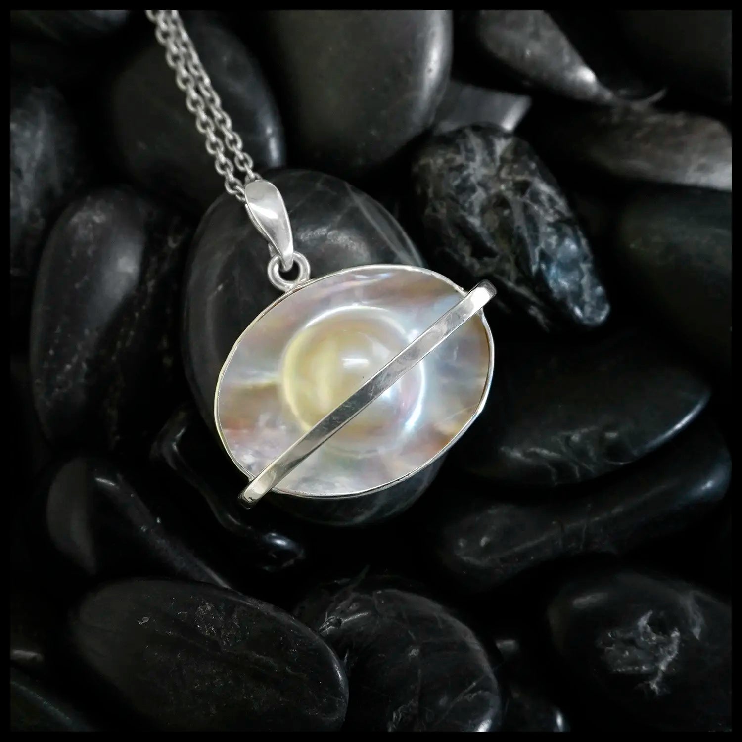 This Custom Sterling Silver pendant is set with a Mabe Pearl. Decorated with hand-chased galaxy designs on the back. This pendant comes with a 18" Cable Chain.
