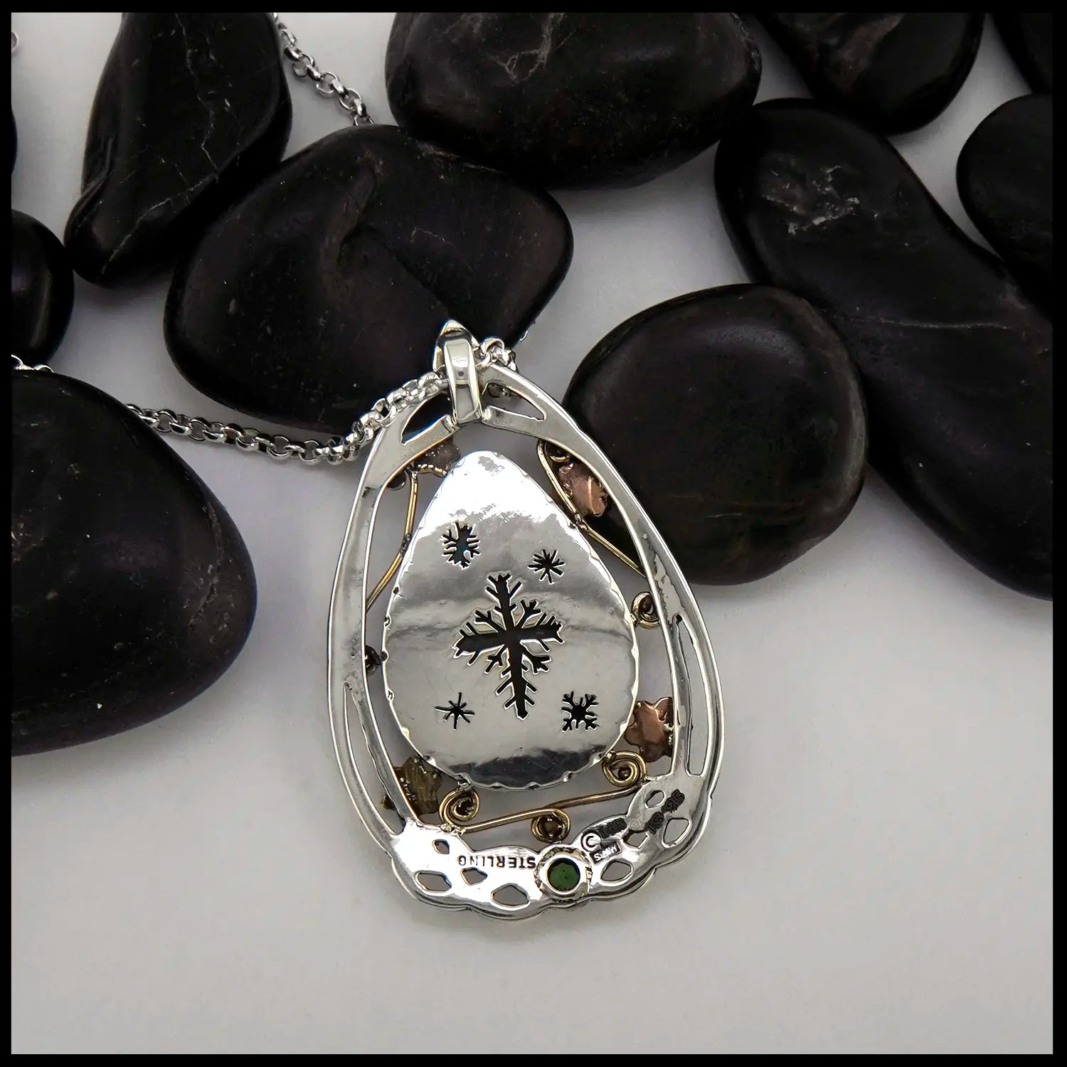 This striking Sterling Silver Frame holds a Custom Cut Chrysocolla center stone, as well as a deep green 3mm Tsavorite. Swirling about the bezel settings are snowflake, spiral, and beading details in 14K Rose and Yellow Gold, as well as 18K Yellow Gold! On the reverse of the pendant hides a flurry of pierced out Snowflakes, making this pendant truly one of a kind! Created by our craftsman Terry, this pendant comes on an 18" Medium Rolo Chain.