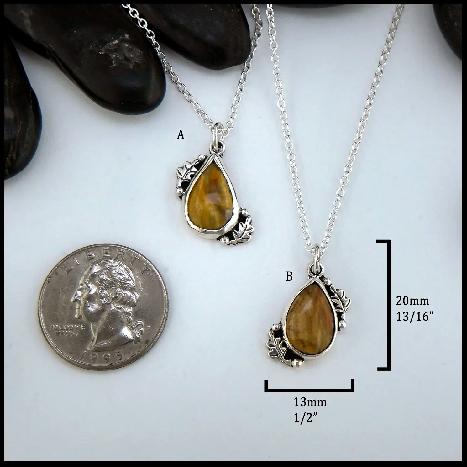 Set in Sterling Silver, these Petrified Wood pendants are a stunning pair! Framed by Oak Leaves and Sterling Silver beading details, these pendants are sold separately. Created by our Craftsman's apprentice Dominic, these pendants each come on an 18" Cable Chain.