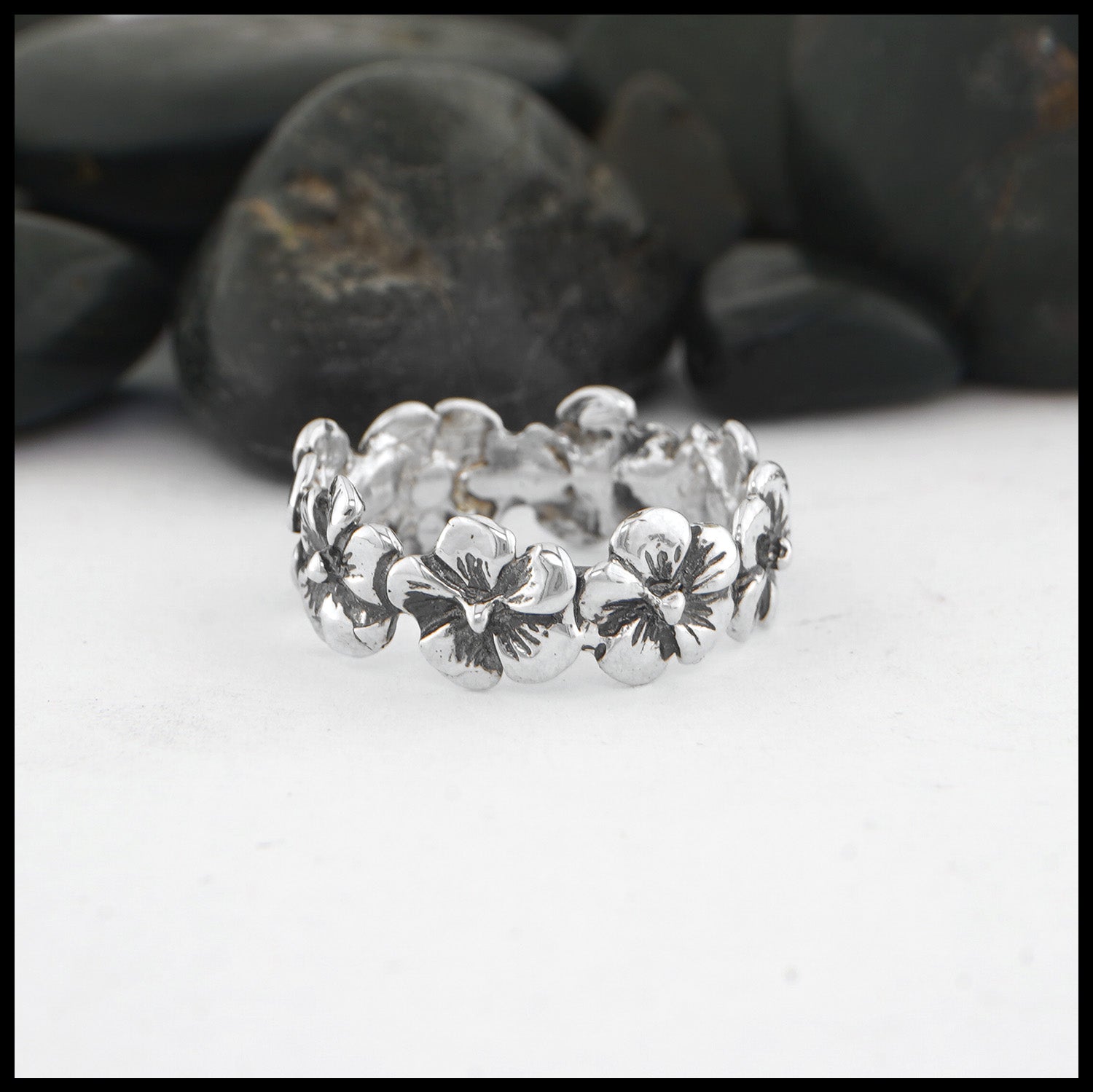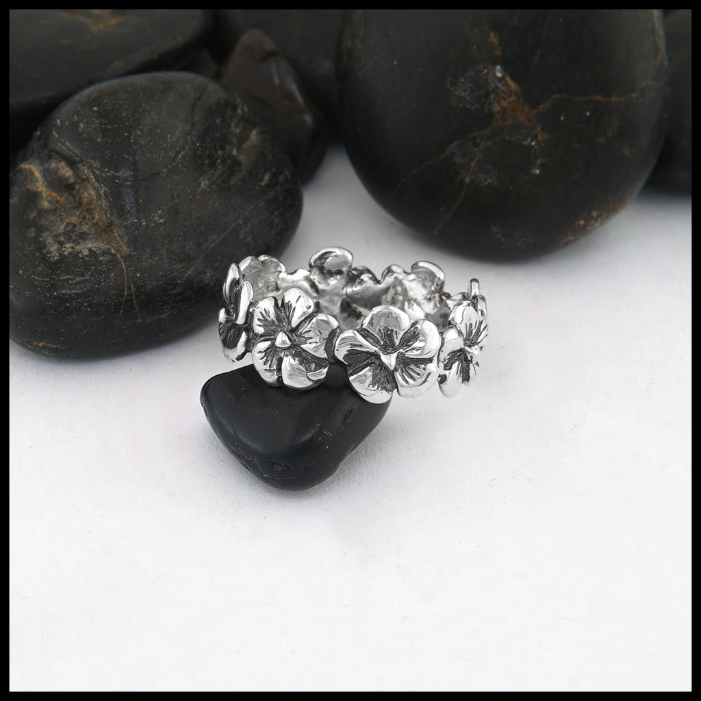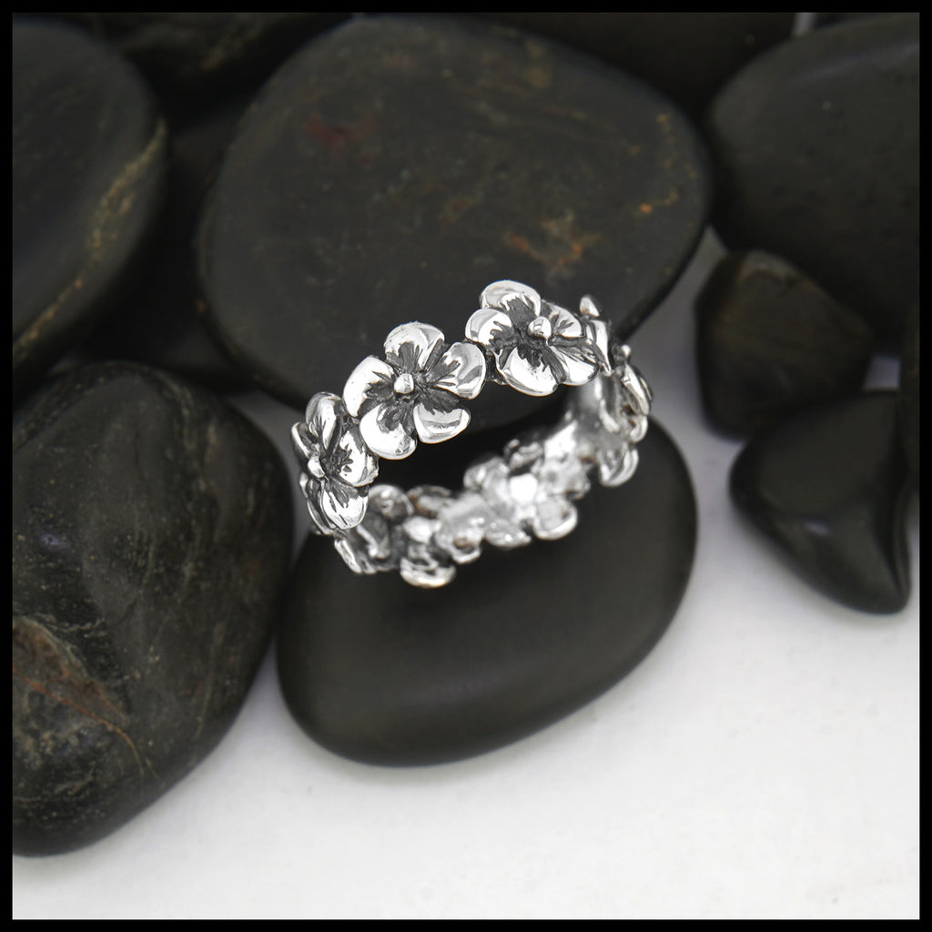 This Sterling Silver Ring is made from casted flowers that were carefully placed and oriented to form a circle for a ring. This ring can not be resized.