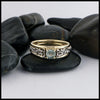 This one-of-a-kind frame ring sets a green sapphire between two smooth 14K yellow gold rails, with white gold trinity knots, Celtic spirals, and granulation beading filling the open gallery on both sides of the stone. The two-tone construction gives each Celtic element its own contrast against the warm yellow gold frame, and the open back lets light pass through the knotwork from every angle. The green sapphire's color plays well against both metals, anchoring the design with a quiet natural richness.