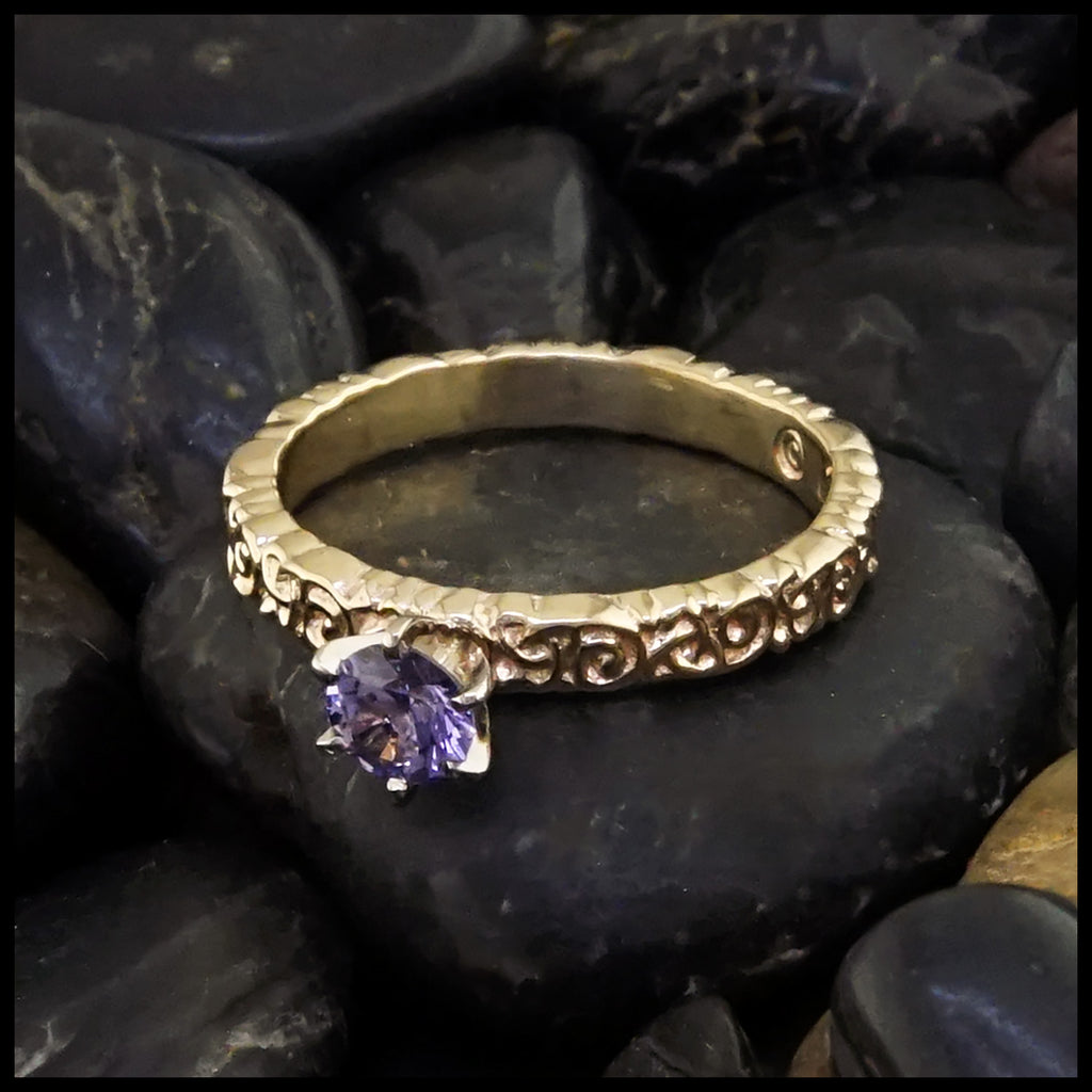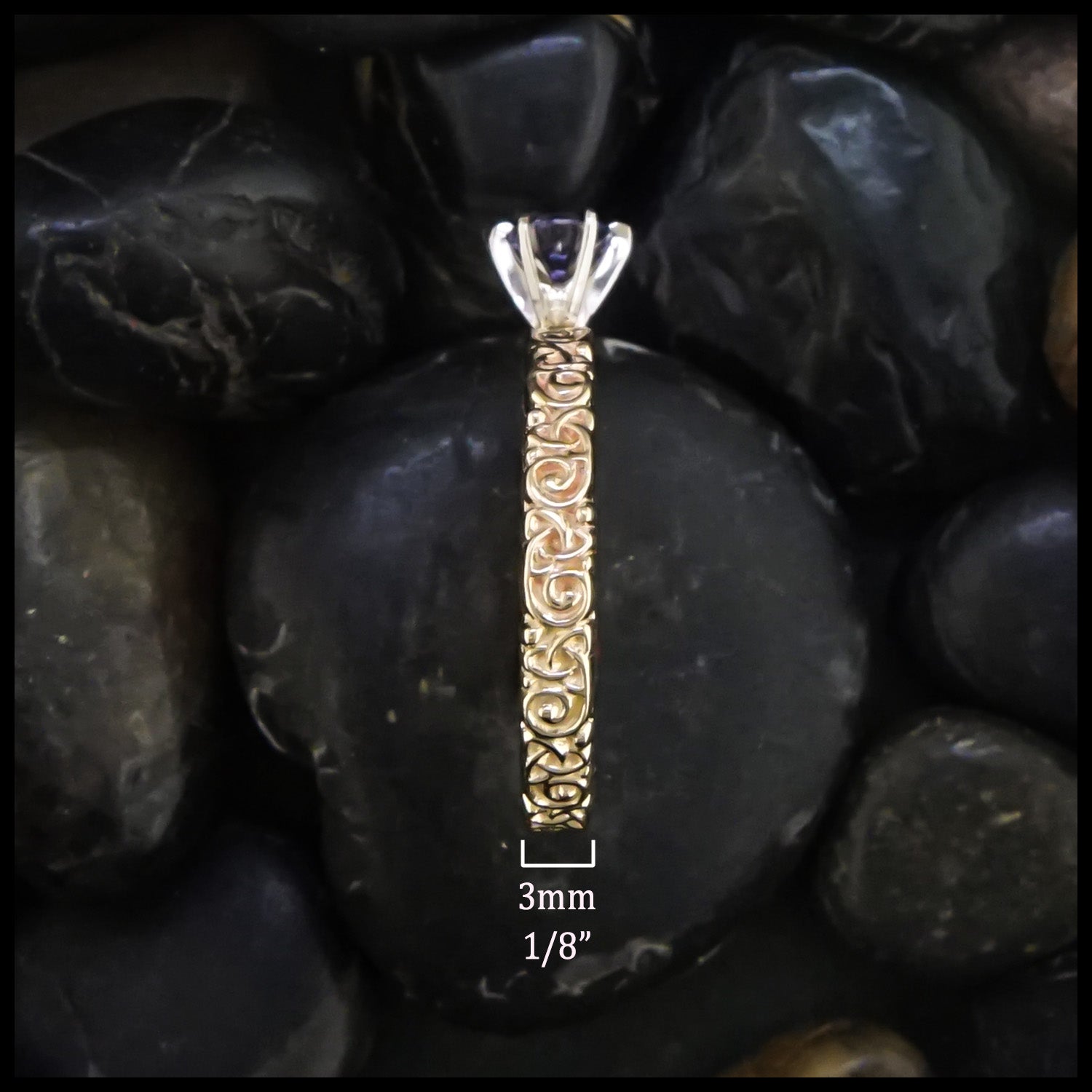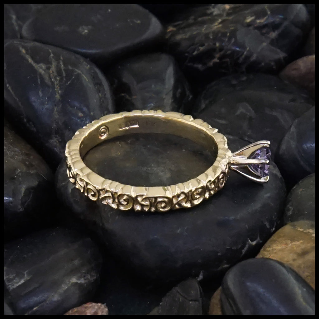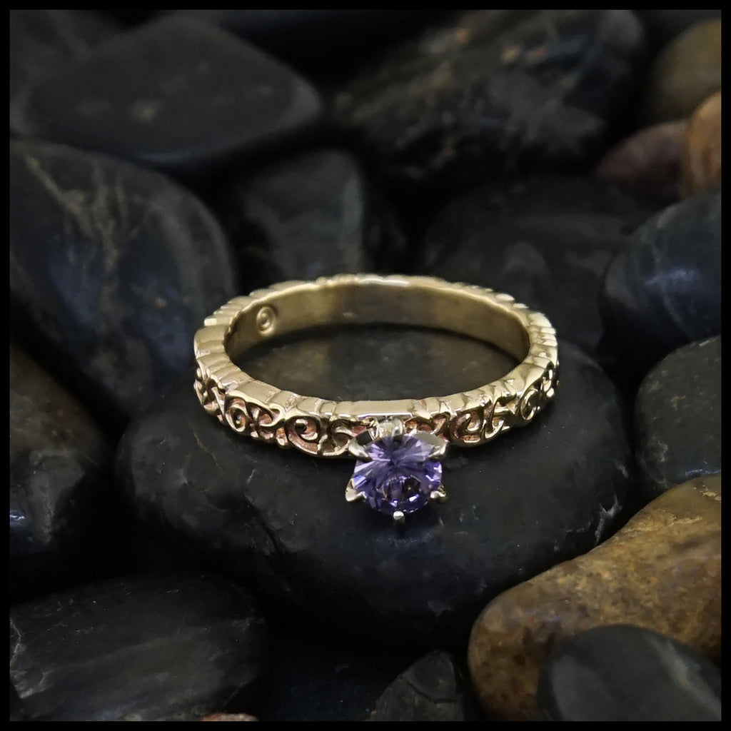 This Trinity Scroll ring is crafted from 14k yellow gold and features a regal purple spinel stone centerpiece. The intricately designed Trinity scroll band adds a touch of elegance and sophistication. An eye-catching and timeless piece that is sure to be a treasured family heirloom. This ring is a size 8. Ring can be resized upon request.
