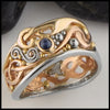 Handcrafted in 14K yellow, rose, and white gold at Walker Metalsmiths in Andover, NY. Set with a blue sapphire cabochon. Pierced Celtic knotwork, spirals, and granulation detailing. Current size: 8; can be made in other sizes.