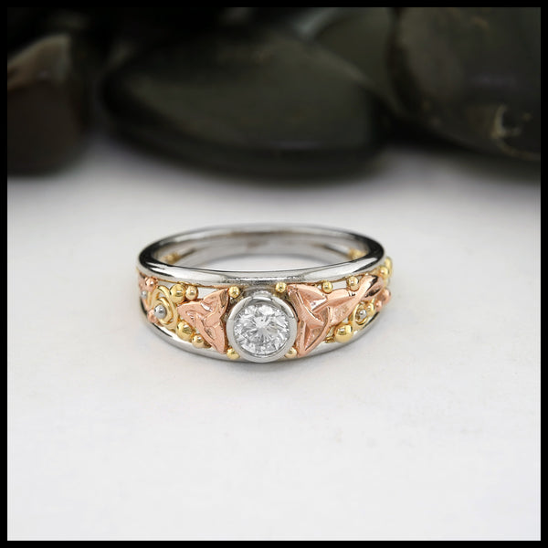 This elegant custom ring has Josephine's Knot detailing on the band in 14K Rose Gold...