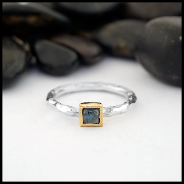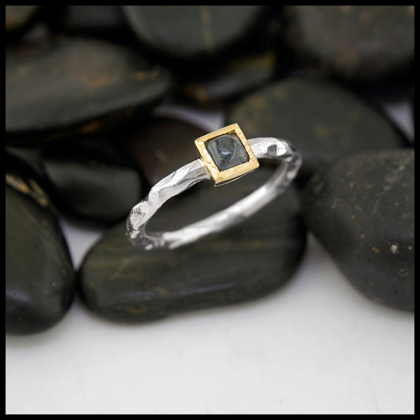 This ring showcases a bezel set .10CT diamond in a custom sterling silver and 14K...