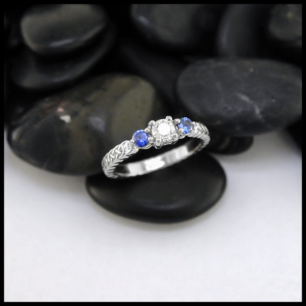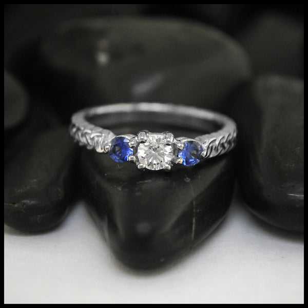 This intricate and eloquent Celtic ring is set with a .75CT, 5.5mm Montana Sapphire. Framed...