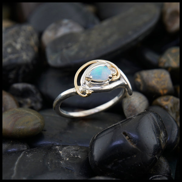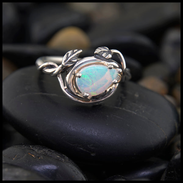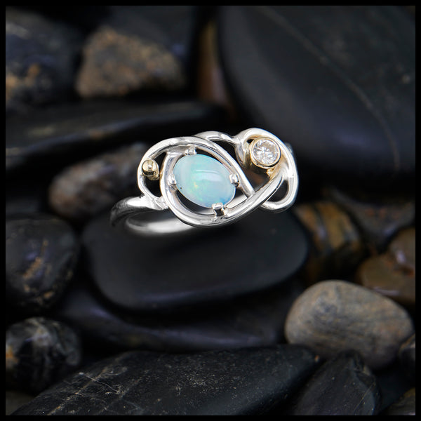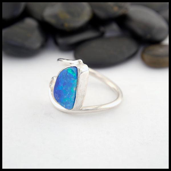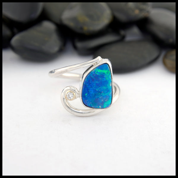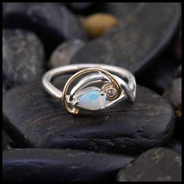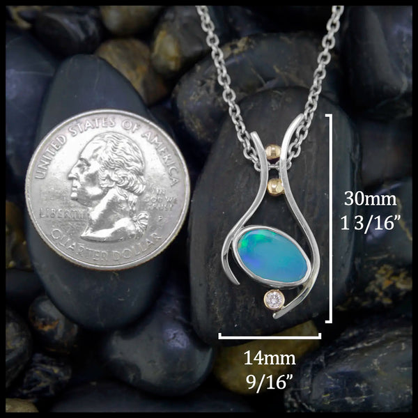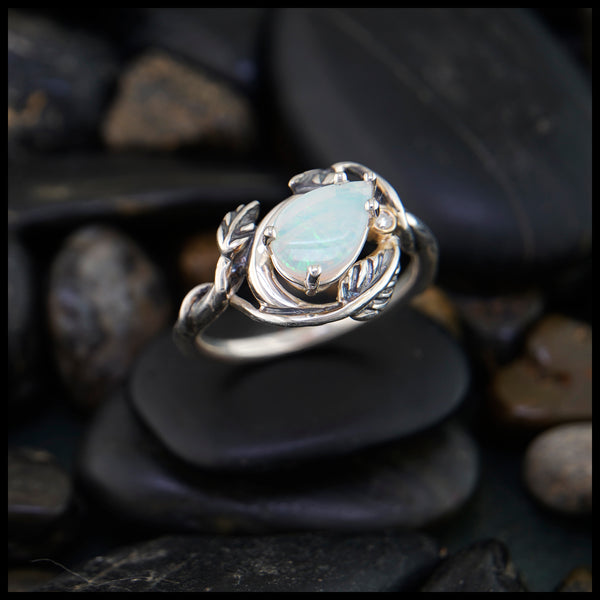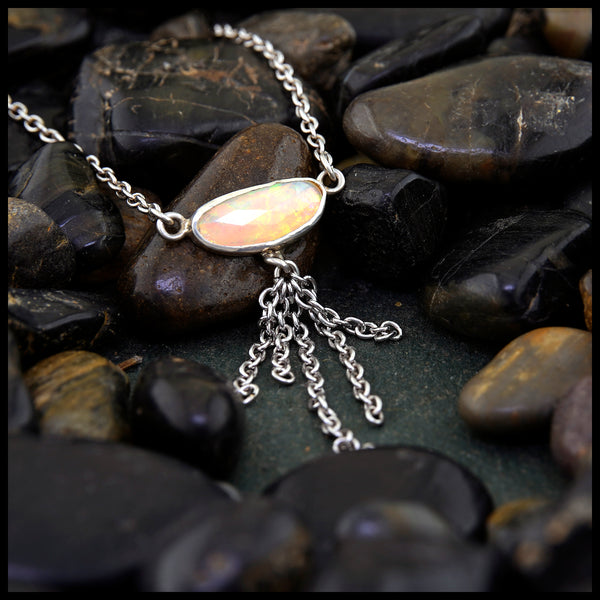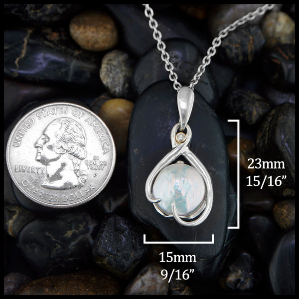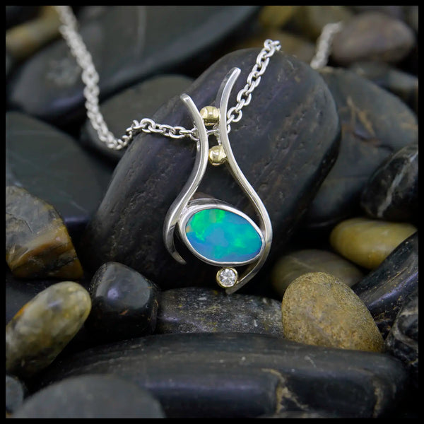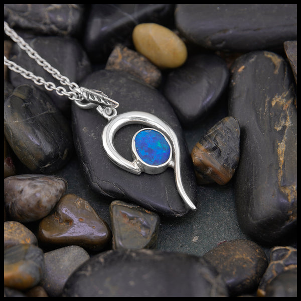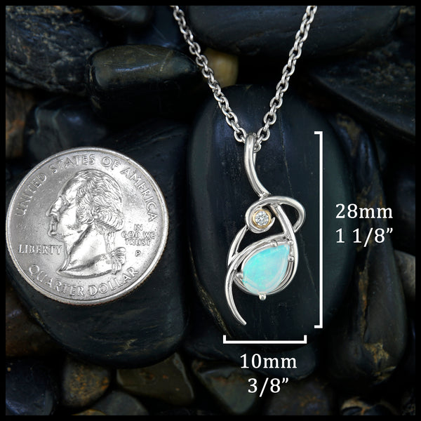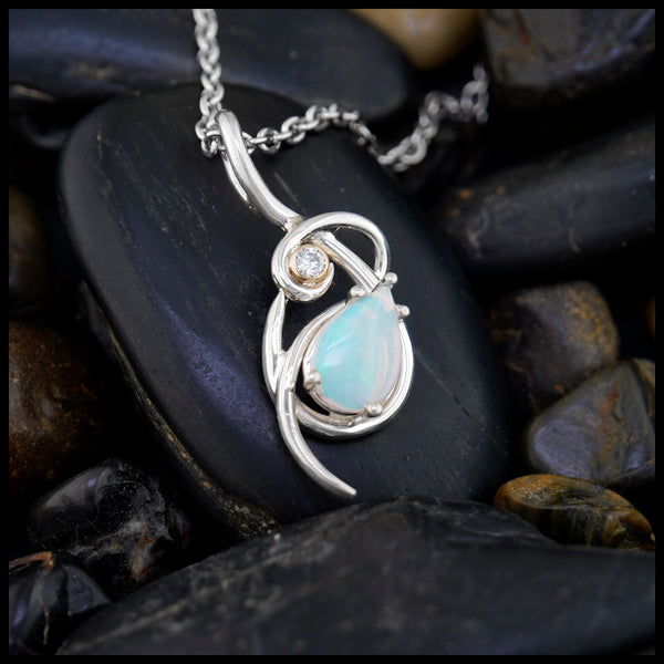 This custom pendant features a pear shaped opal set in a custom sterling silver ribbon...