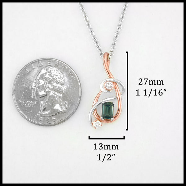 This unique pendant features a blend of sterling silver and 14K yellow gold frame holding...