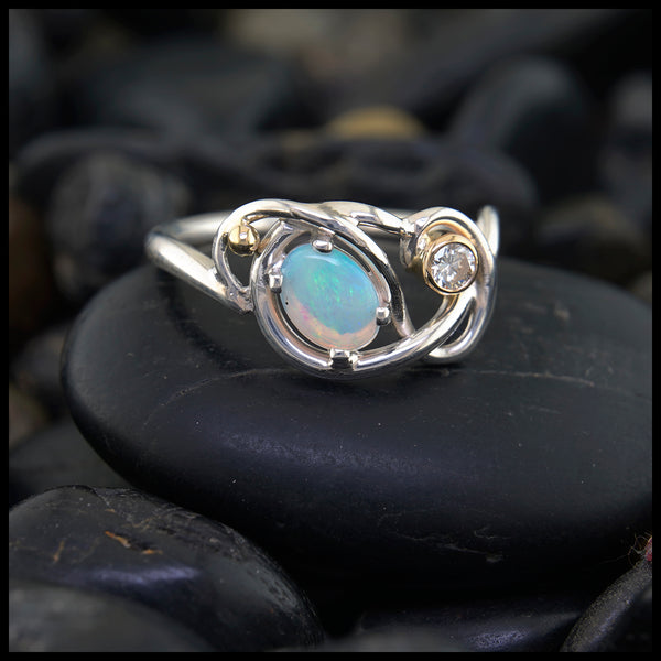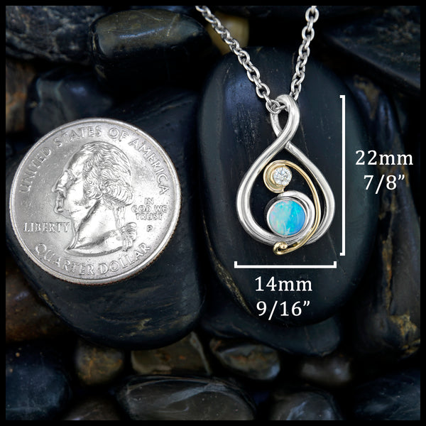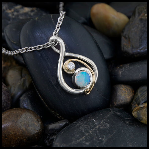 This handmade pendant features an opal bezel set in a custom swirling sterling silver frame....