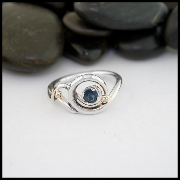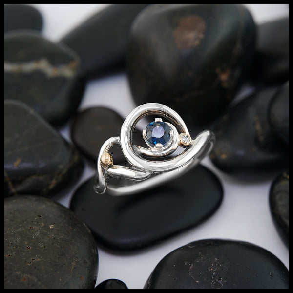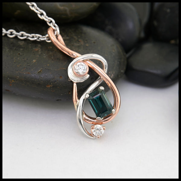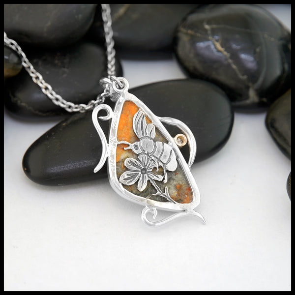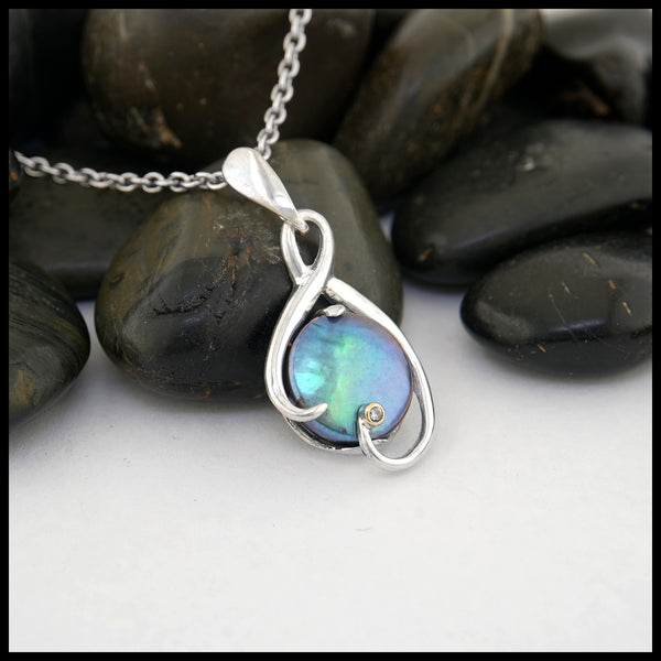 This custom pendant features a handmade sterling silver frame resembling waves. Resting in these waves...