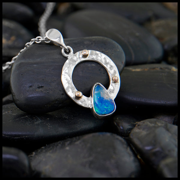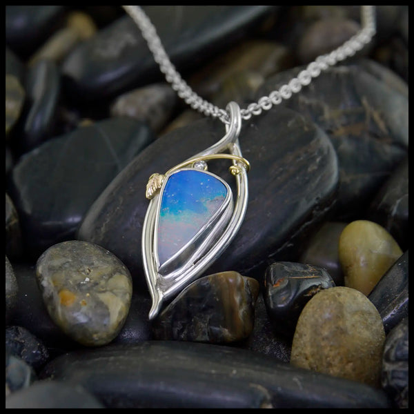 This unique pendant showcases an australian boulder opal set in a custom sterling silver bezel....