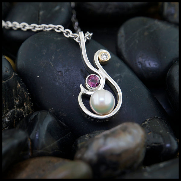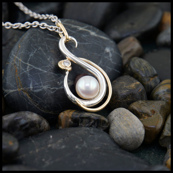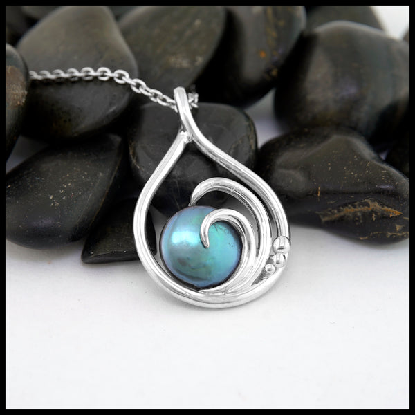 This dainty pendant holds a gorgeous pearl set in a wave inspired custom sterling silver...