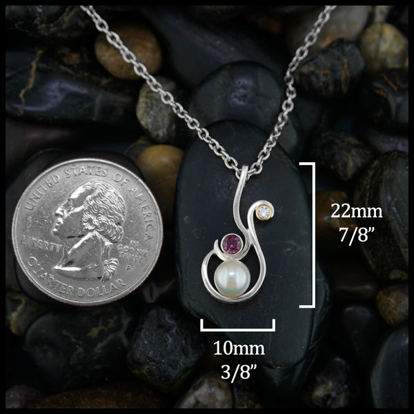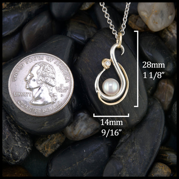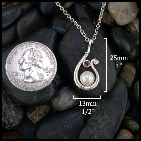 This dainty pendant holds a gorgeous pearl set in a custom sterling silver frame. Accenting...