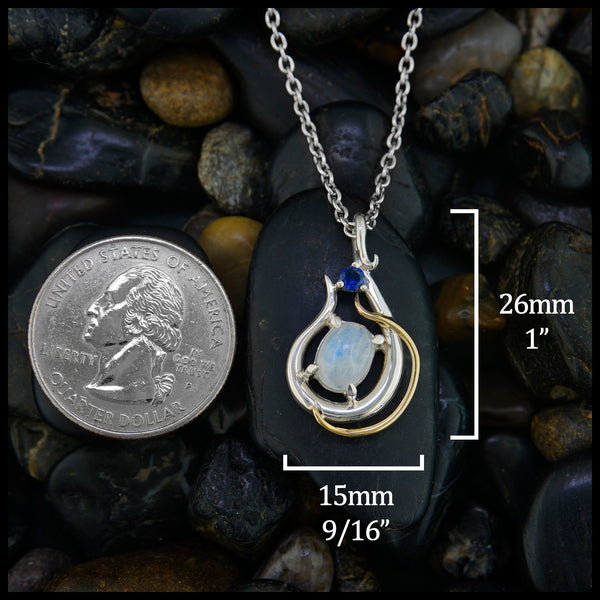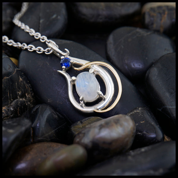 This unique pendant features a rainbow moonstone set in a custom swirling sterling silver frame....
