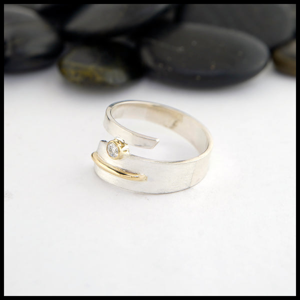 Wide Sterling Silver ring set with a Moonstone Cabochon, decorated with a 14K Yellow Gold...