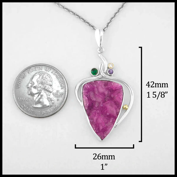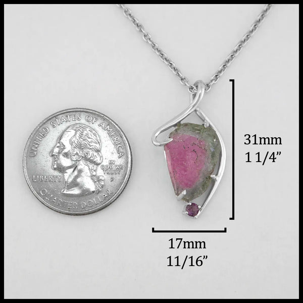 This pendant features a watermelon tourmaline slice set in a custom sterling silver frame with...