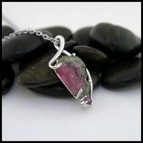 This pendant features a unique watermelon tourmaline centerpiece set in a custom sterling silver frame....