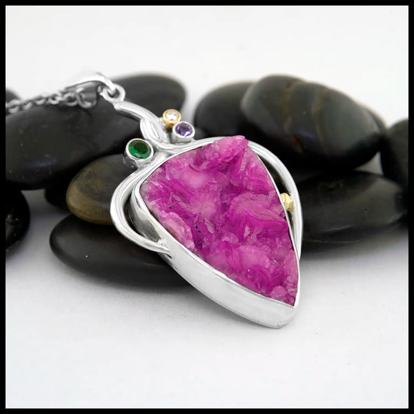 This unique pendant features a sterling silver frame fitting a large pear shaped cobalton calcite...
