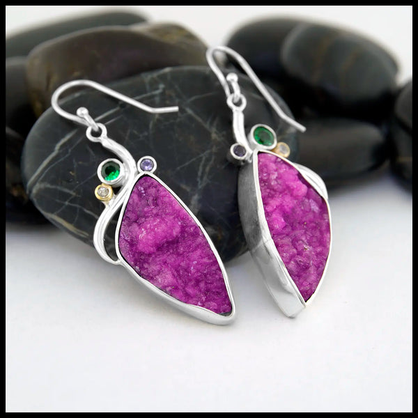 These unique earrings features a sterling silver frame fitting a cobalton calcite centerpiece. The center...