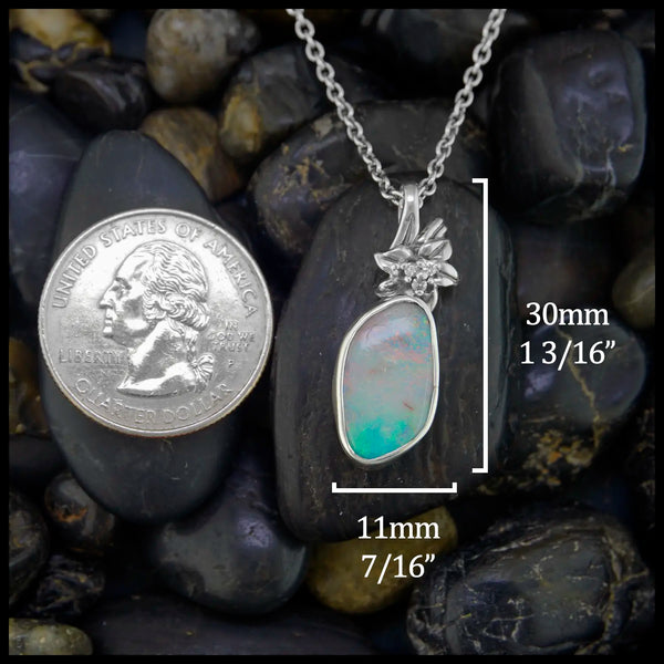 This unique pendant features an australian opal centerpiece that is accented by a sterling silver...