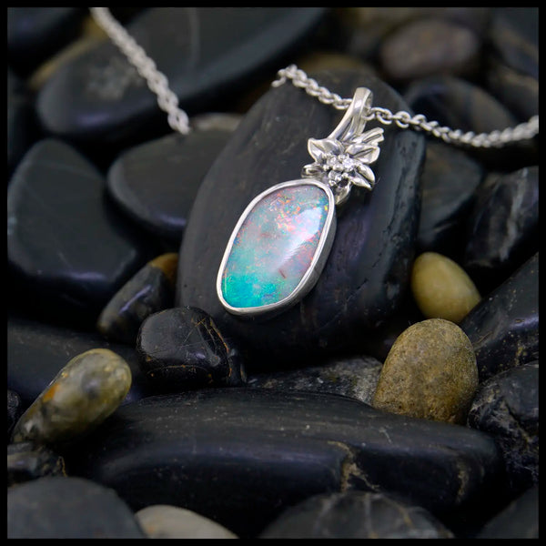 This custom gemstone pendant features an australian boulder opal centerpiece set in a custom sterling...