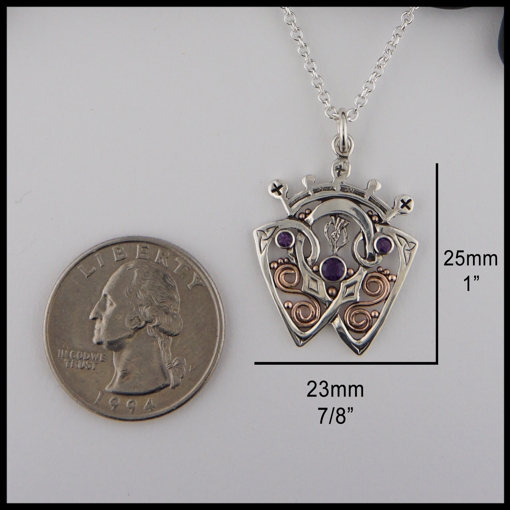 Custom pendant in Sterling Silver and 14K Rose Gold. This luckenbooth design features spirals, a thistle, and a 3mm and 2 2mm Amethyst gemstones. This pendant comes with an 18" Sterling Silver Cable Chain.