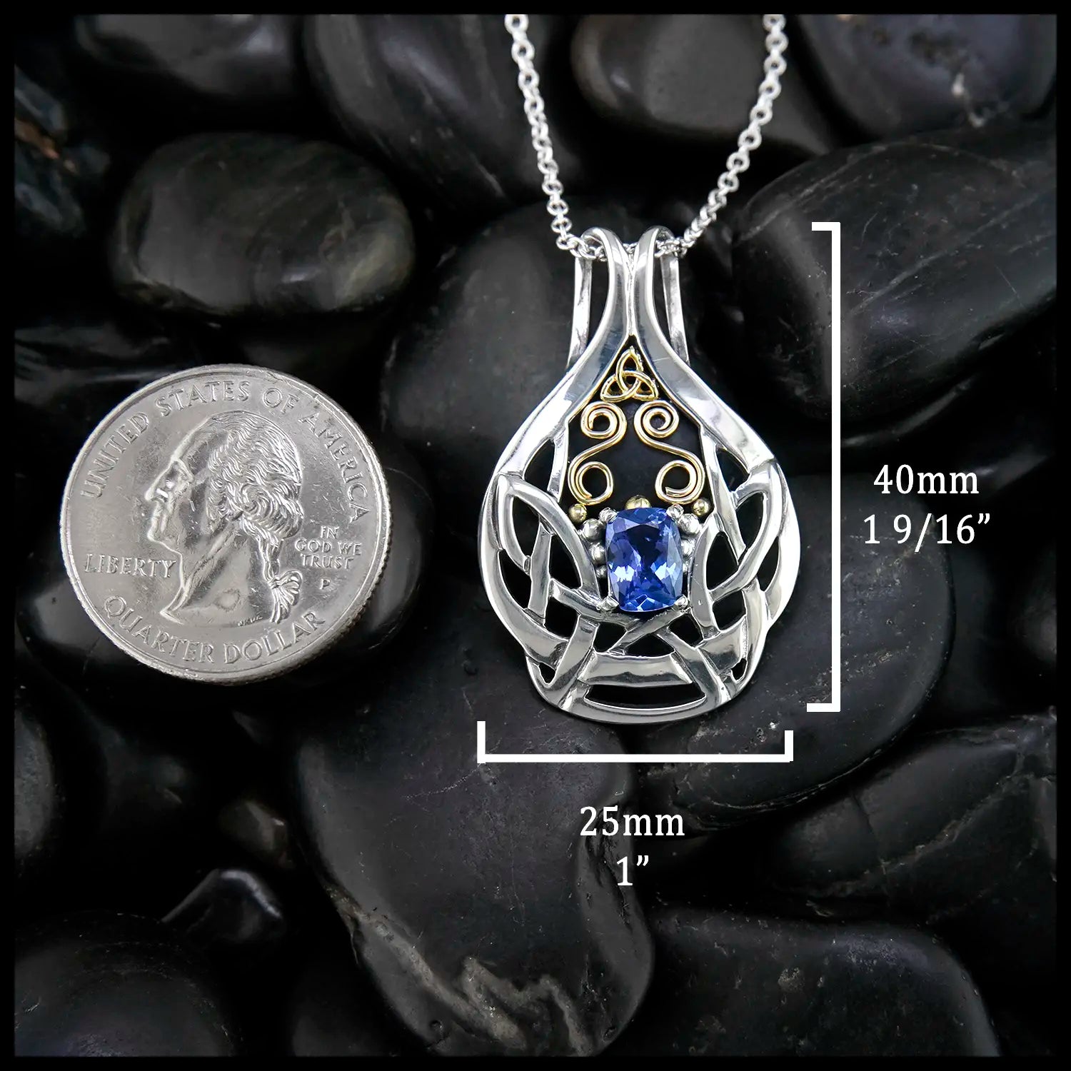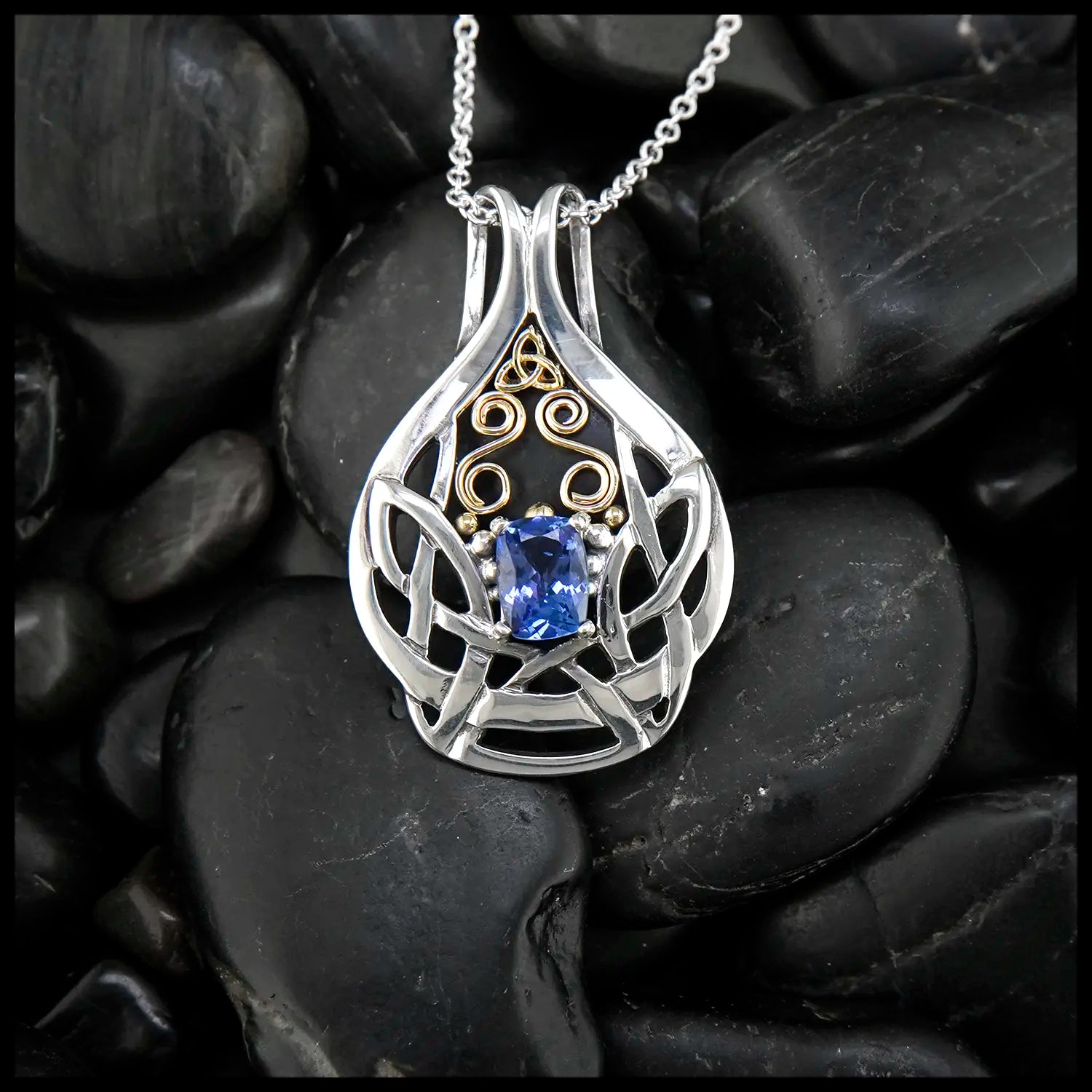 Set in a Sterling Silver Frame, this stunning 1.32 carat Cushion Cut Tanzanite sparkles like no other! With18K Yellow Gold Trinity Knot, Spiral, and beading detail- this pendant is the definition of Celtic elegance! created by our craftsman Nicole, this pendant comes on an 18" Cable Chain.