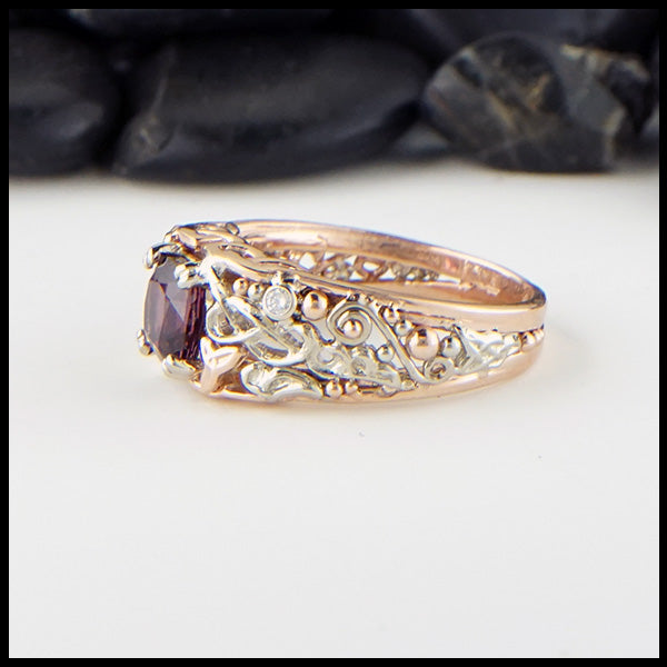 Custom ring in 14K Rose & White Gold set with a center Purple Garnet cushion stone, with two small accent diamonds. Ring is currently a size 7.5, but can be re-sized.