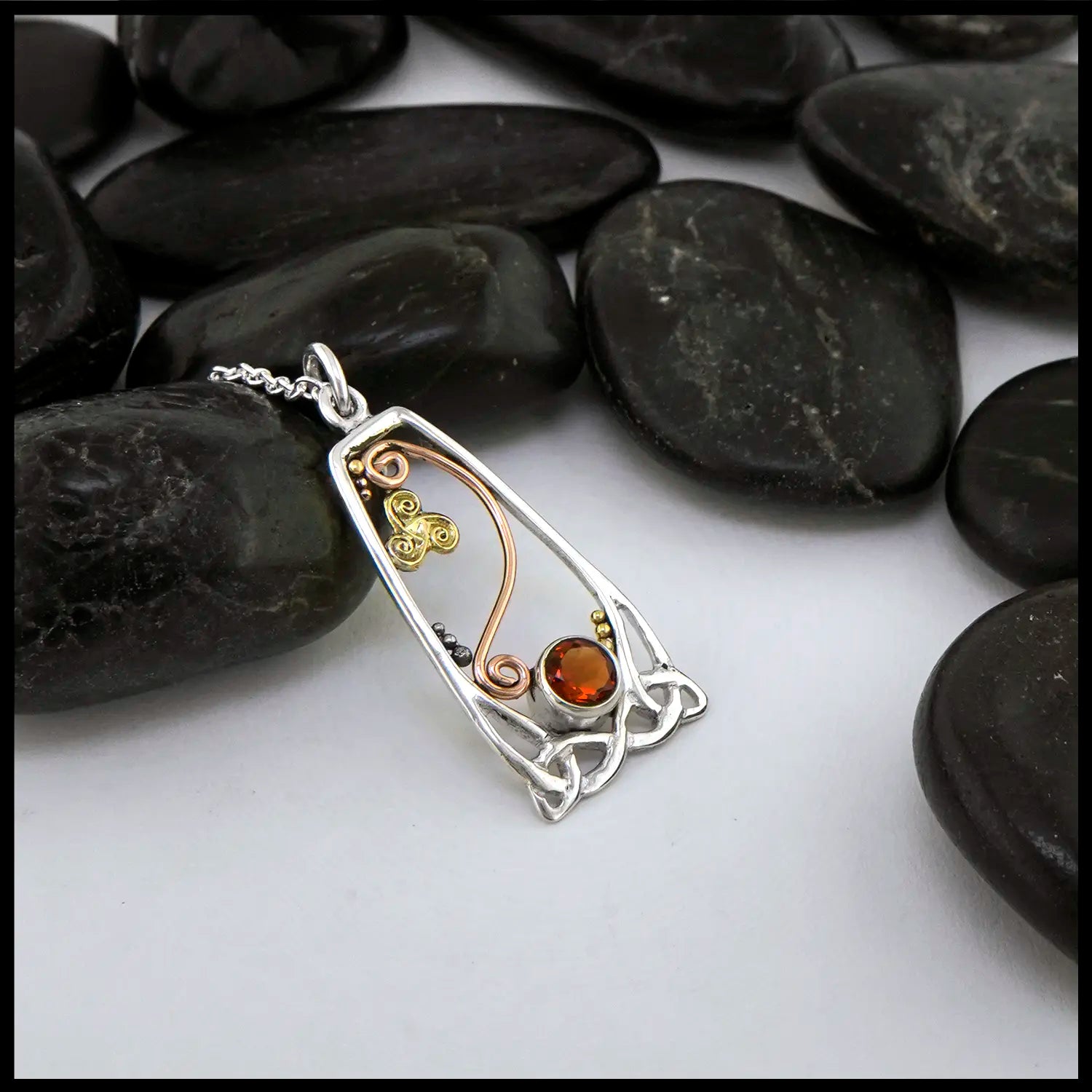 These gorgeous pendants feature 5mm Citrines, bezel set in a Sterling Silver Frame. Accenting the deep orange stones are 18K Yellow gold Triskeles, 14K Rose gold spirals, and tri-toned beading detail in Sterling Silver, 14K Yellow Gold, and 14K Rose gold. Designed by our craftsman Terry,- each pendant comes with an 18" Cable Chain.