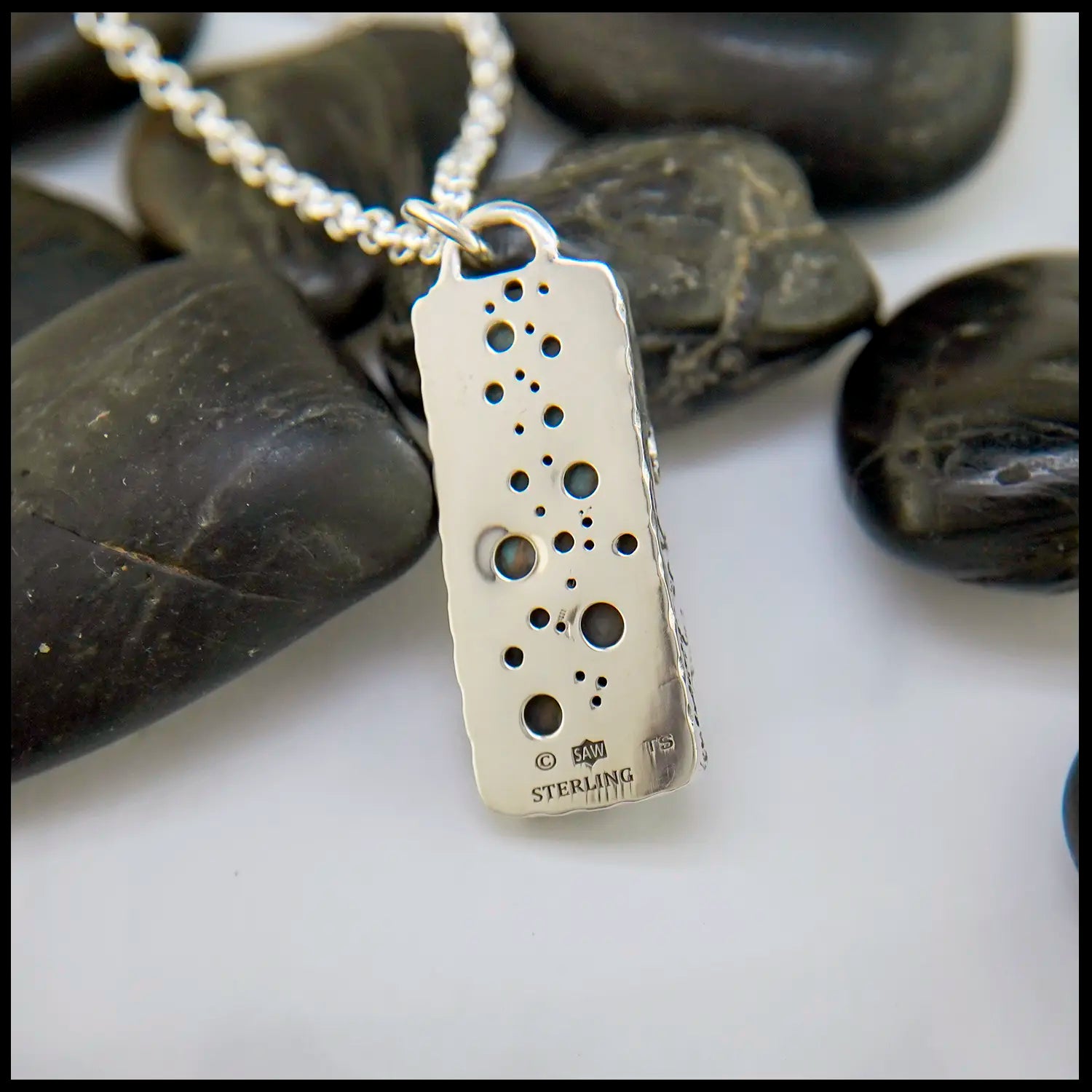 This oceanic treasure features a custom cut Oyster Turquoise. On the reverse of this custom wave-style setting hides bubble detailing! Created by our craftsmen Terry, this pendant comes with an 18" Medium Rolo Chain.