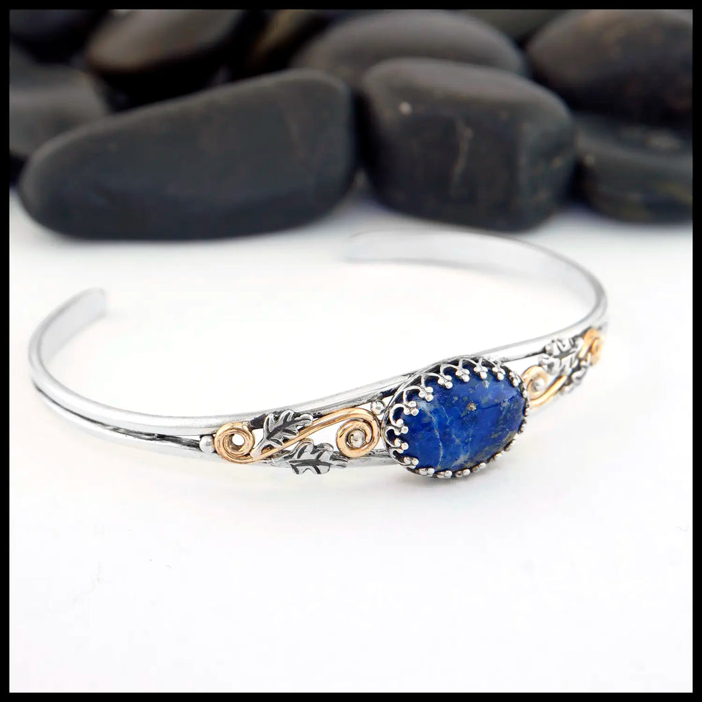 Custom and distinct, this cuff bracelet is set in a Sterling Silver frame with Oak Leaf accents and beads to match! Highlighting the deep blue Sodalite a 14K gold filled spiral details in Yellow Gold. This bracelet fits a 7 inch wrist.