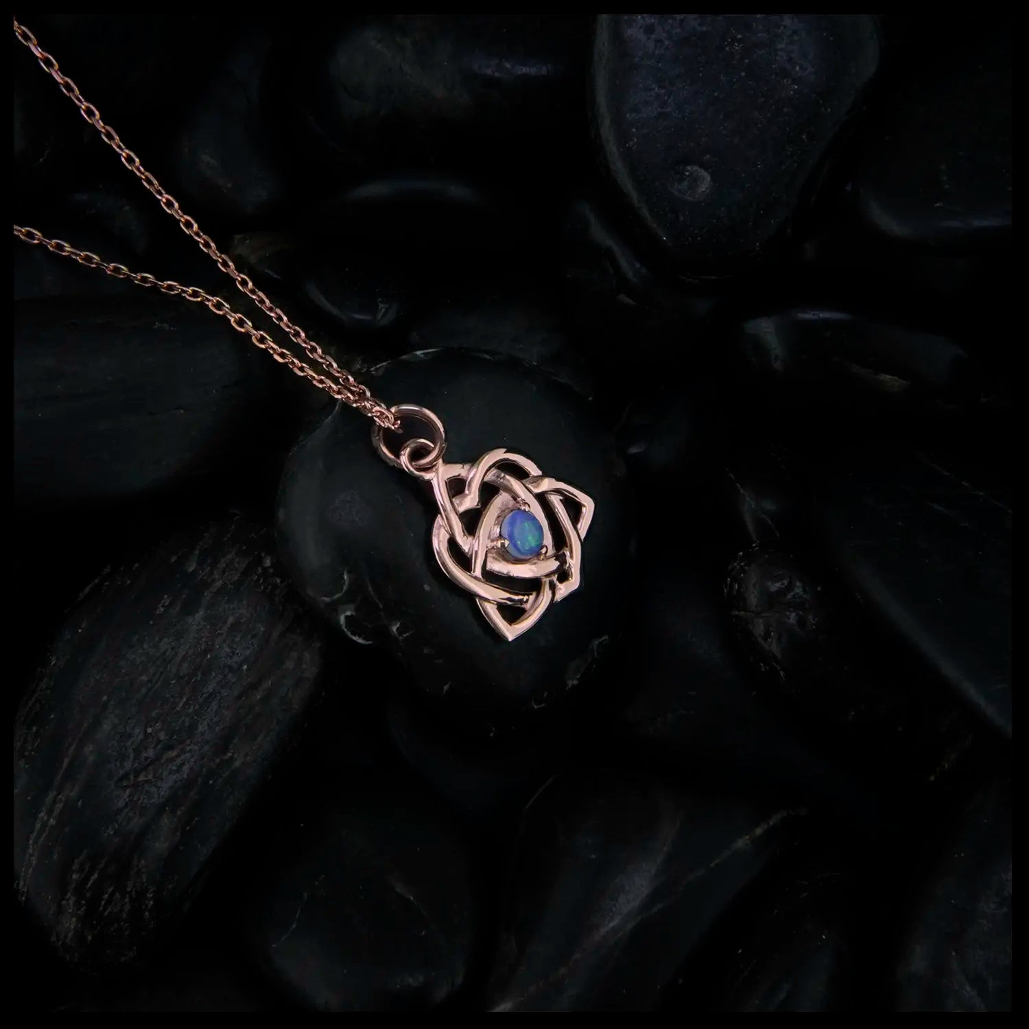 Set with a 4mm Opal, this Trinity Knot Heart Pendant is set in 14K Gold of your choice: Rose, White or Yellow. This pendant comes with an 18" Chain in Gold.