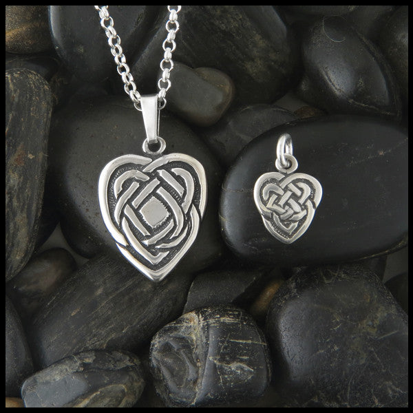 The Maggie's Heart pendant is available in two sizes. The Maggie's Heart was originally designed by Stephen Walker for his second daughter Maggie. The intricate Celtic knotwork forms a heart to symbolize the interconnectedness of life and love.