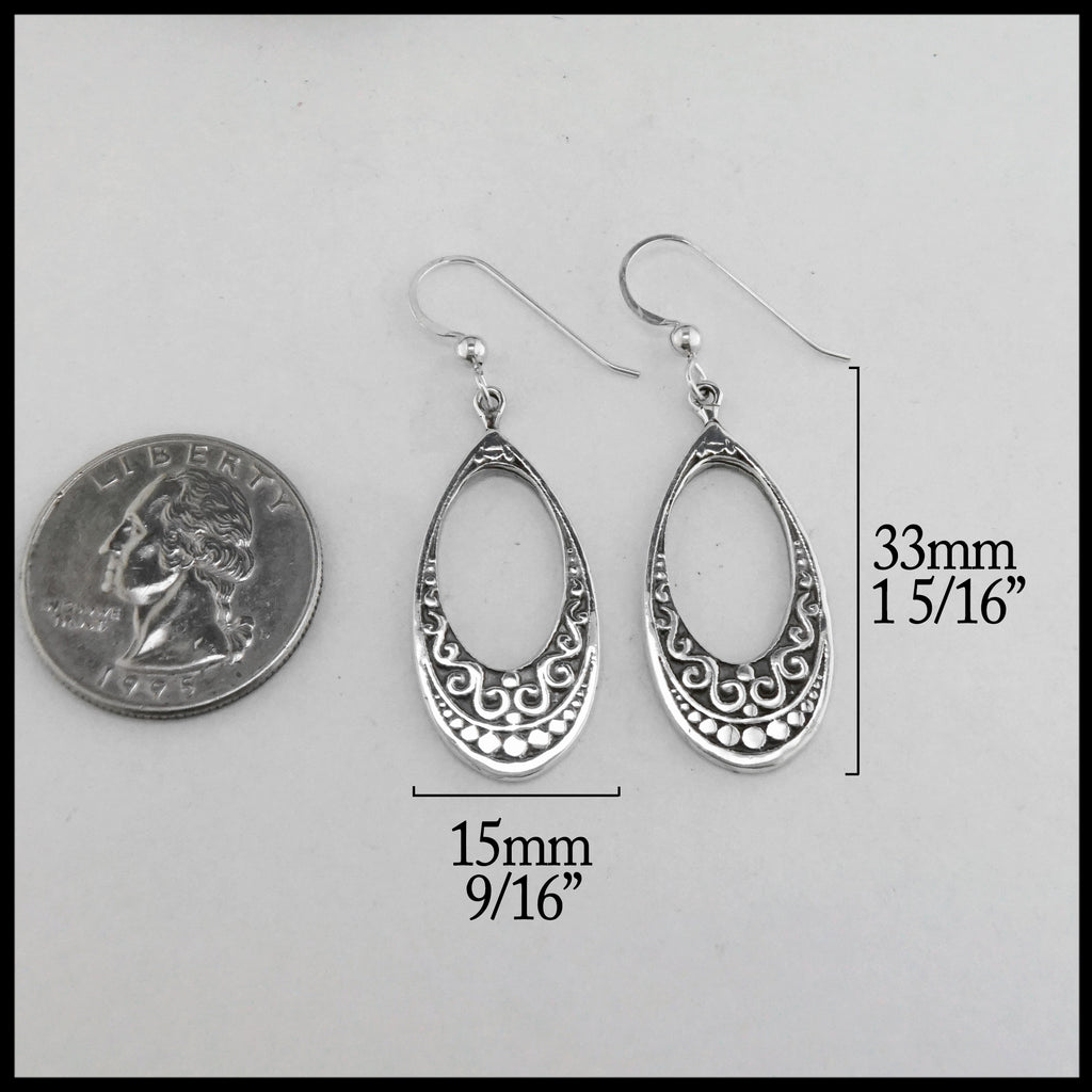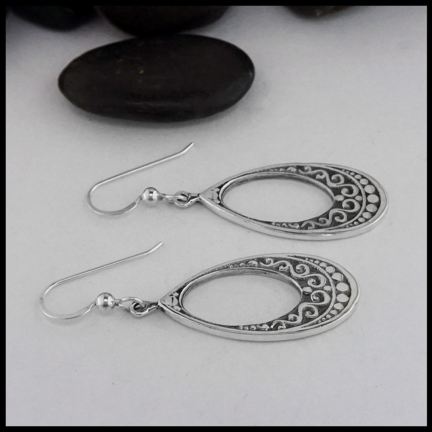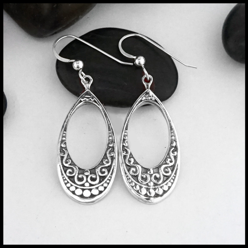 The Moiraine's Ornate Teardrop earrings are silver. These earrings have a timeless and historical feel.