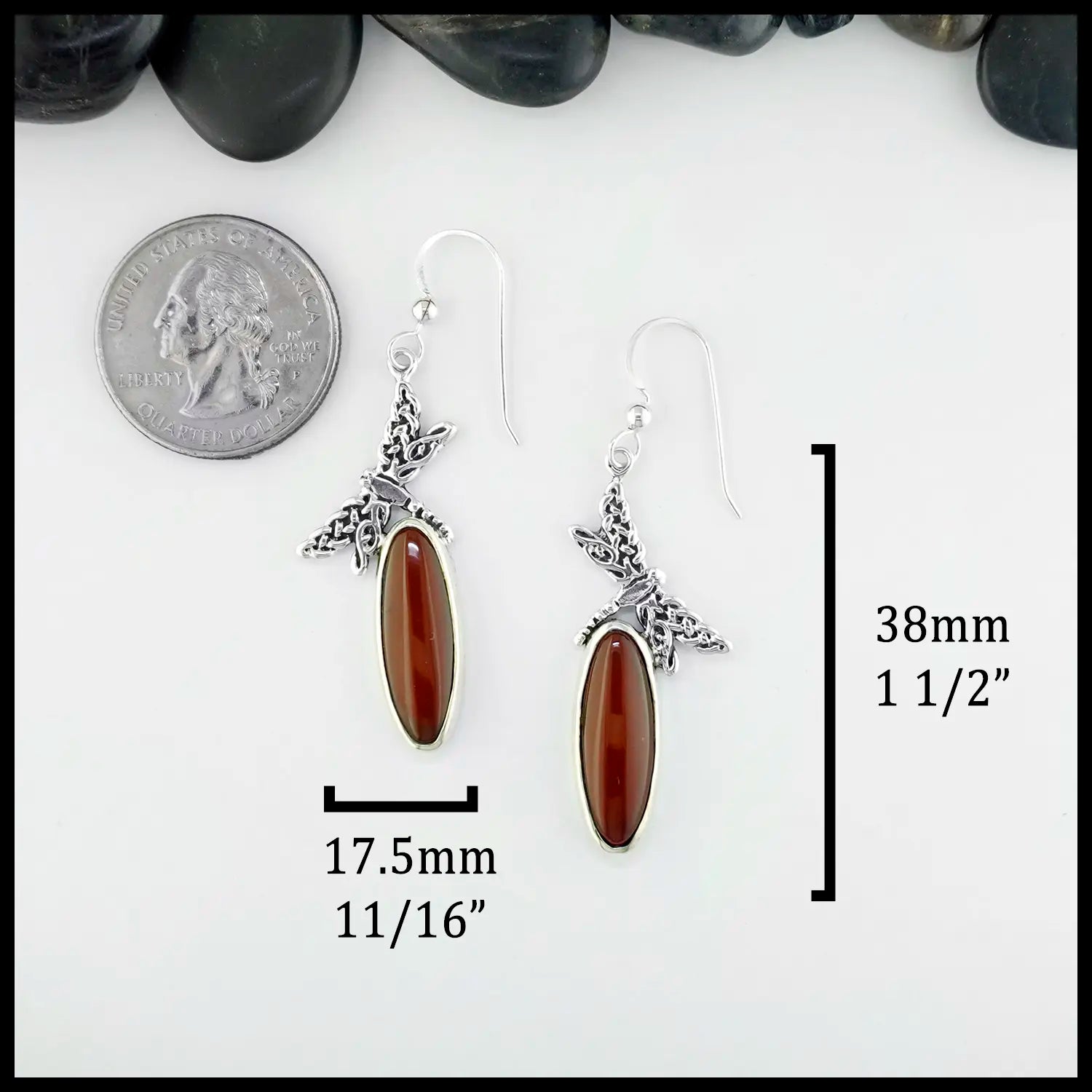These custom Carnelian Drop Earrings are bezel set in Sterling Silver, and decorated with our classic Celtic dragonflies. Created by our craftsmen Sydney, these earrings are one of a kind!