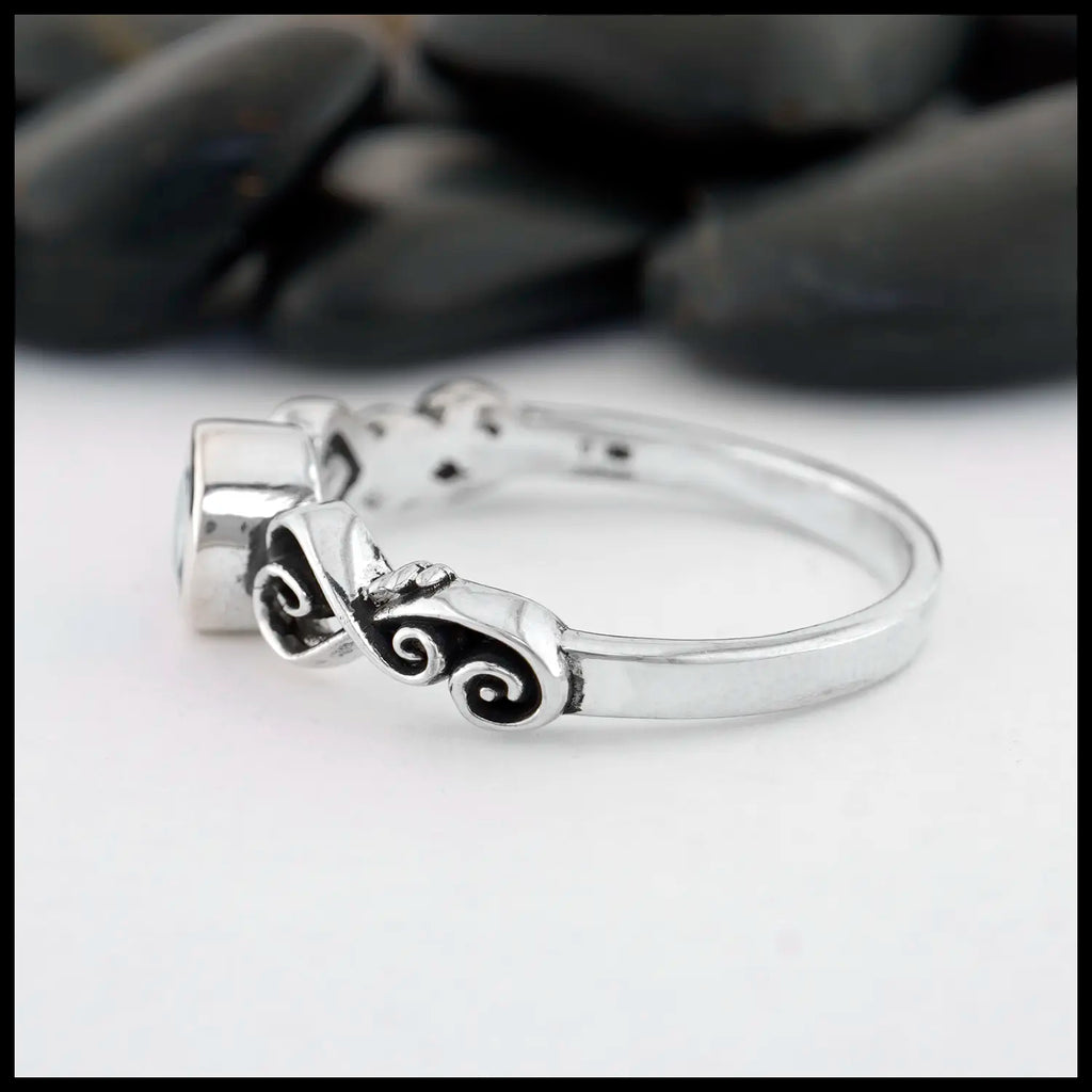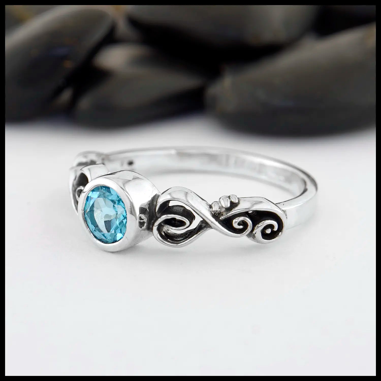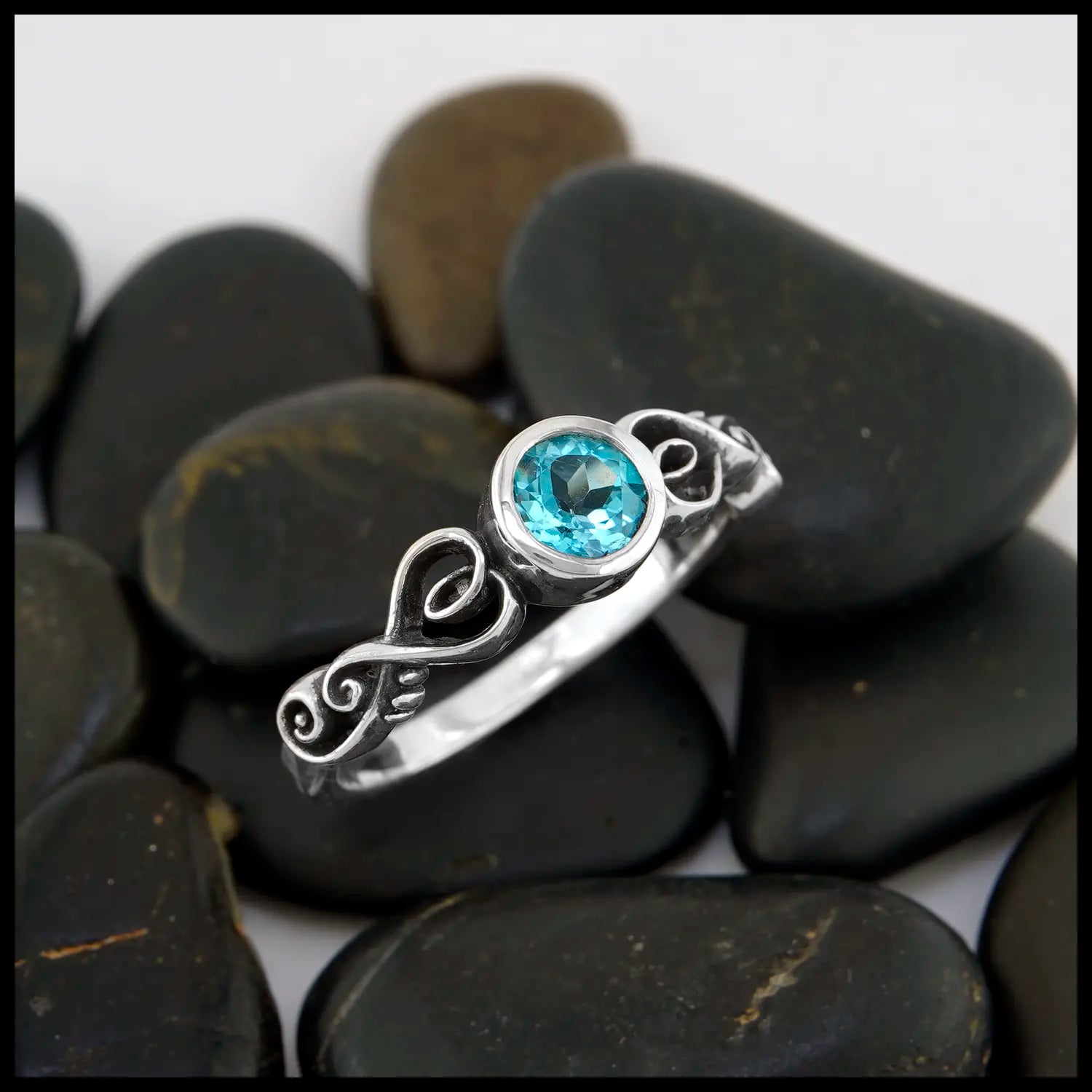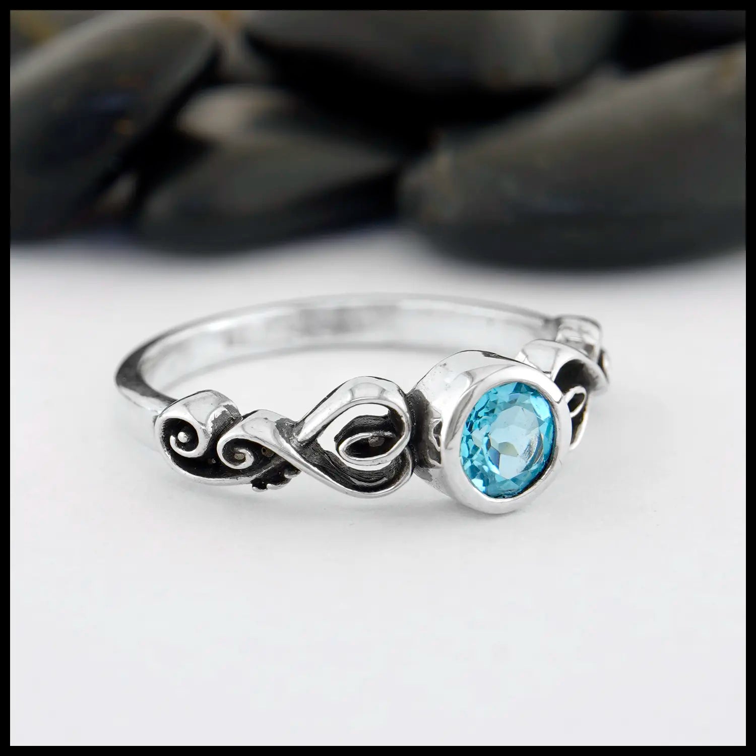 This ring features a genuine 6mm topaz set in sterling silver. The bands are decorated with a swirling Celtic heart. The ring shown is a size 7.
