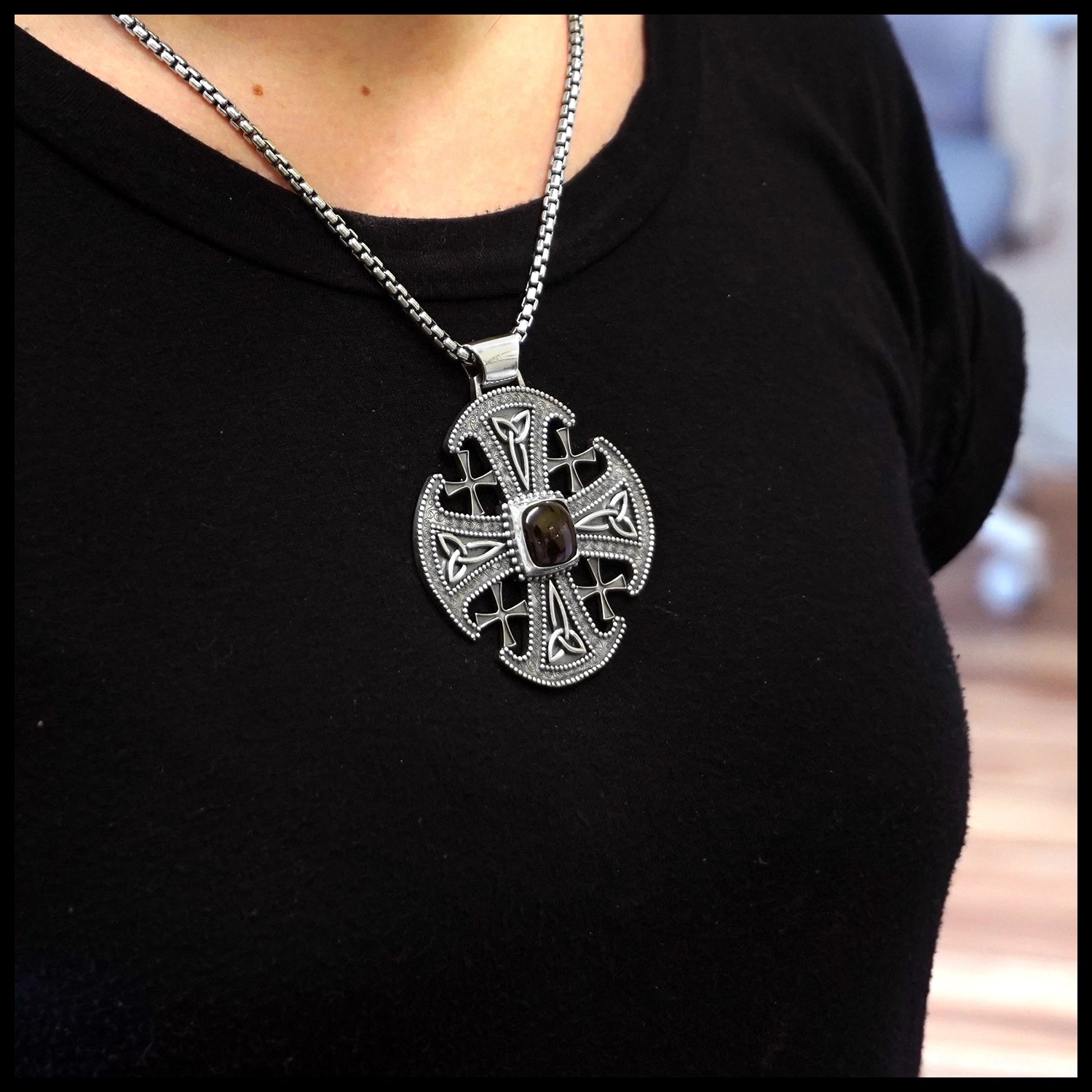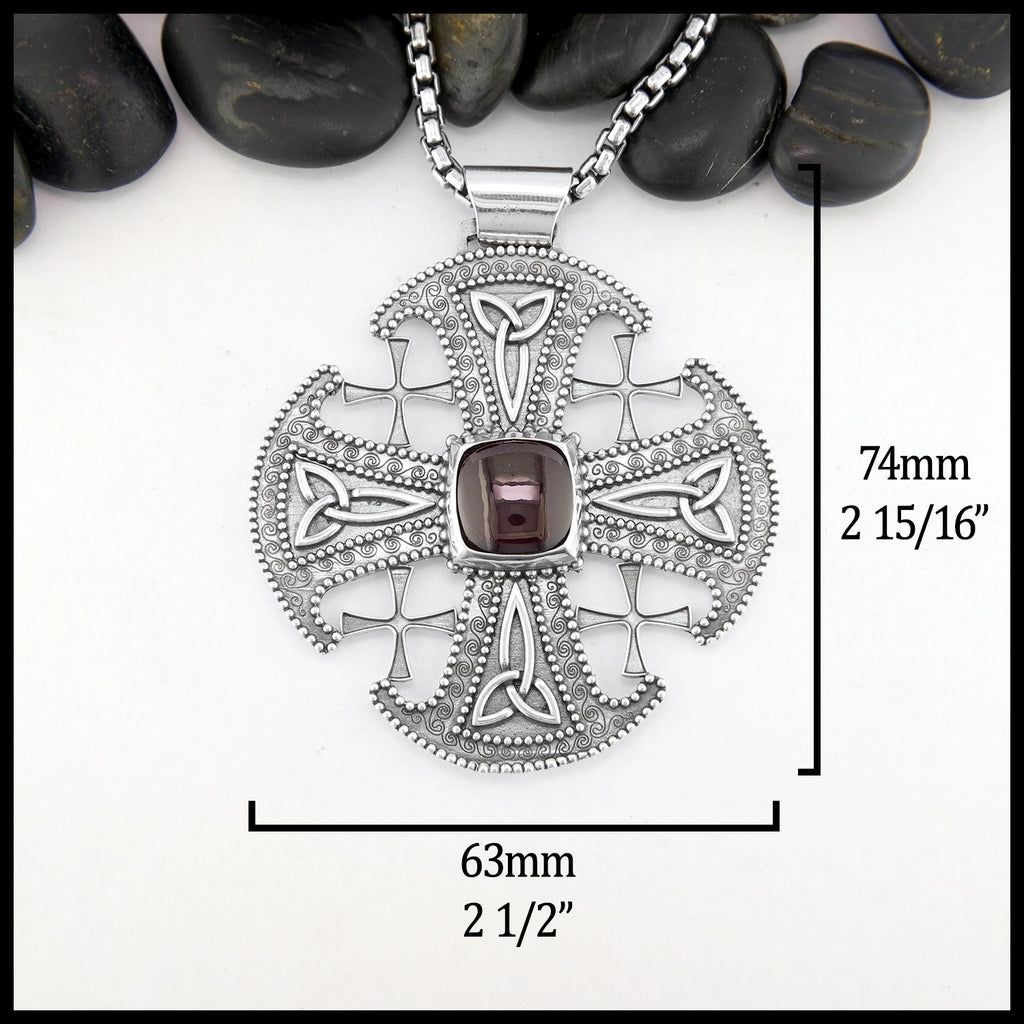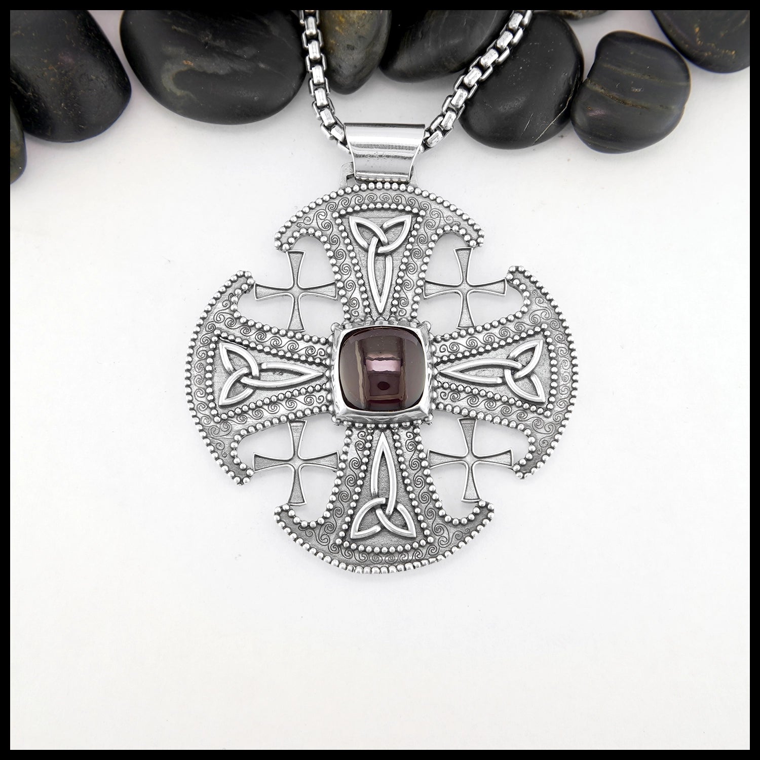 Cast in sterling silver, this cross is a fusion design from the 8th century Canterbury cross and Jerusalem cross encompassing a gorgeous, deep red garnet. This cross comes with a 24" heavy rounded box chain.