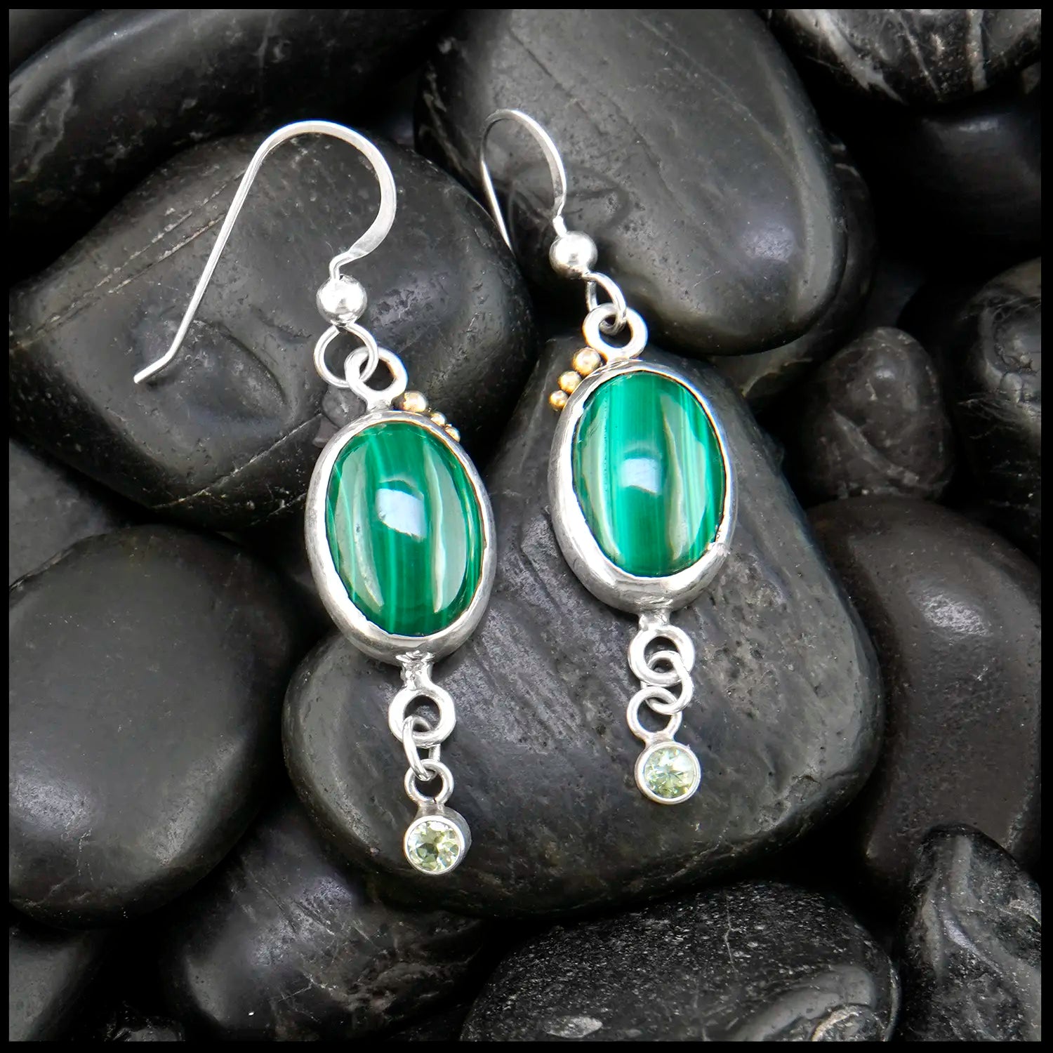 Set in Sterling Silver custom bezel settings, these Malachite and Mint Garnet Drop Earrings feature gorgeous shades of green. With 18K Yellow Gold beading details, these earrings make the perfect gift! Created by our craftsman Terry, these earrings are available for a limited time.